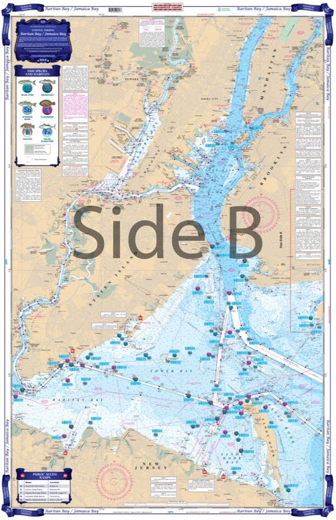 Coastal Fishing Chart - Side A has complete coverage of Raritan Bay with information from NOAA Charts #12327 and #12334. Coverage goes from Union City on the Hudson River down to Sandy Hook and back up to Newark. Side B is compiled from NOAA Chart #13250 . Coverage from Rockaway Point and Manhattan Beach out to Atlantic Beach and back up to North Channel and Great Bay. With the help of local guides,like Al Ristori, and tackle stores, we have pinpointed the most likely areas to hold Striped Bass, Bluefish, Sea Bass and others. These areas are designated on the chart with a symbol of the species caught in that area. We have also pre plotted dozens of GPS Waypoints to make it easier for you to get to these hotspots. You can sit at the dock and enter the coordinates into your GPS, hit go, and you are on your way to some great fishing. This New Coastal Series comes Folded and lists most of the popular Boat Ramps as well as Marinas and Bait Stores for your convenience. This chart is a great complement to all of the other WATERPROOF CHARTS of this area. Chart is 25" X 38". WGS84 - World Mercator Datum.