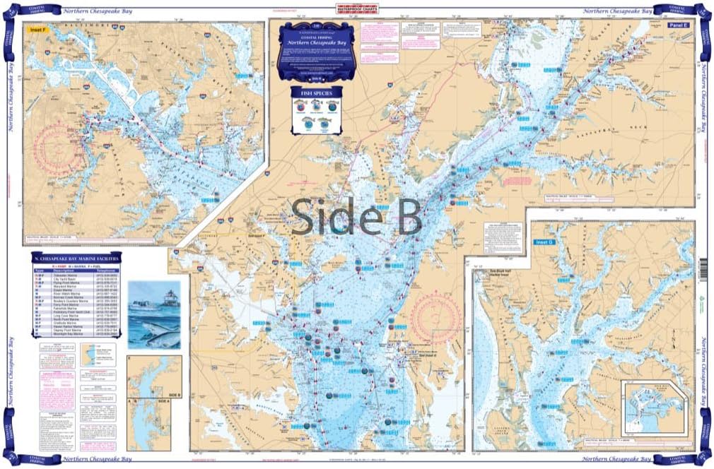 Local Fishing Spots for Blue Fish, Croker, Drum, Flounder, Mackerel, Seatrout, Striped Bass, White Perch, and Weakfish all with GPS Waypoints. Complete coverage from the C&D canal south past Annapolis to the Choptank River and Cove Point. Six Insets provide details for Chester River, Baltimore Harbor, Annapolis, the Tred Avon River, and Choptank River. Colored Keys on both sides make it easy to understand. Most Marinas and Boat Ramps are listed. Information from 7 different NOAA Charts; #12263, #12266, #12268, #12270, #12278, #12272, and #12273. Chart is 25" X 38". WGS84 - World Mercator Datum.