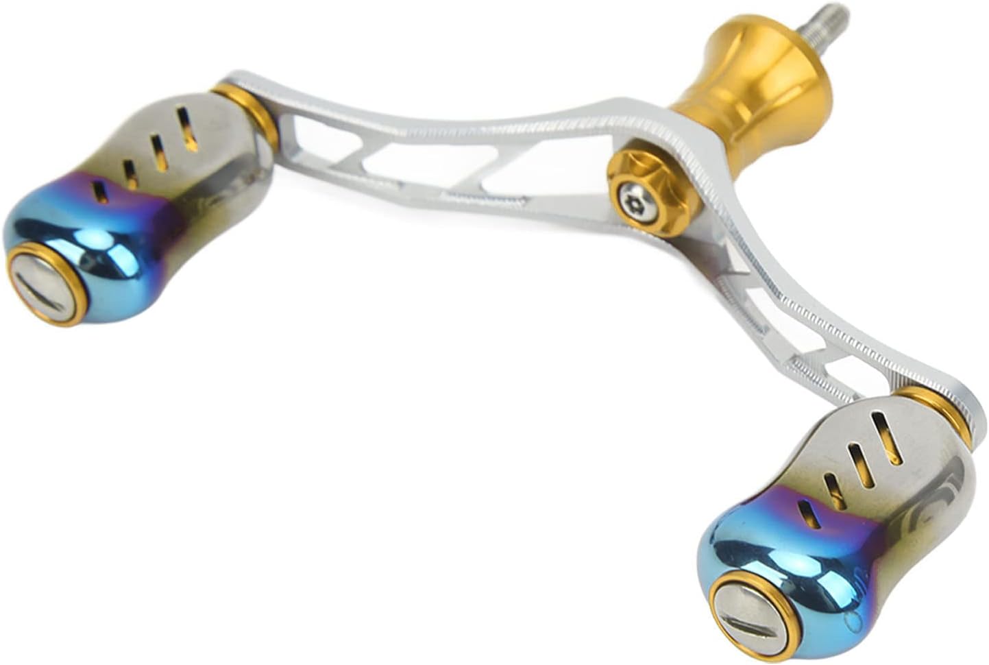 Item Type: Spinning Reel HandleMaterial: Aluminum AlloyWeight: Approx. 176g/6.2ozPackage List:1 x Modified Rocker Arm2 x Balance Bar Interface2 x Rubber Stopper1 x Balance Rod4 x Counterweight Block1 x Interface1 x Screwdriver1 x Spring1 x Rubber Rings