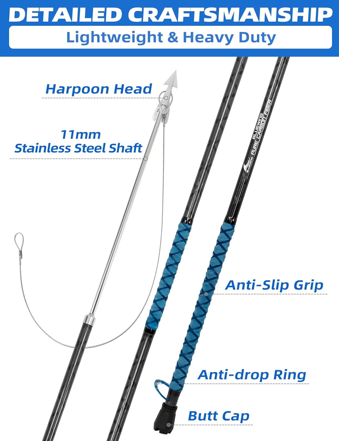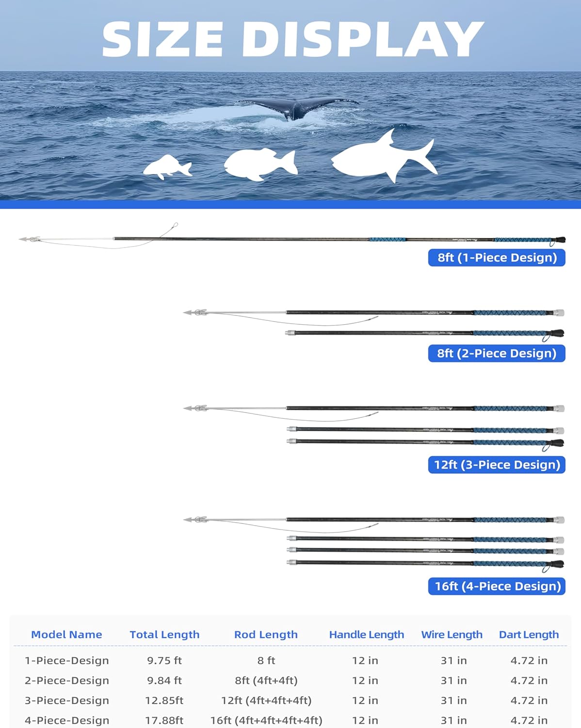 BLUEWING Front Weighted Fishing Harpoon Carbon Fiber Lightweight Spearfishing Pole 8ft/ 12ft/ 16ft Heavy Duty Harpoon with Stainless Steel Dart for Tuna, Marlin, Swordfish
