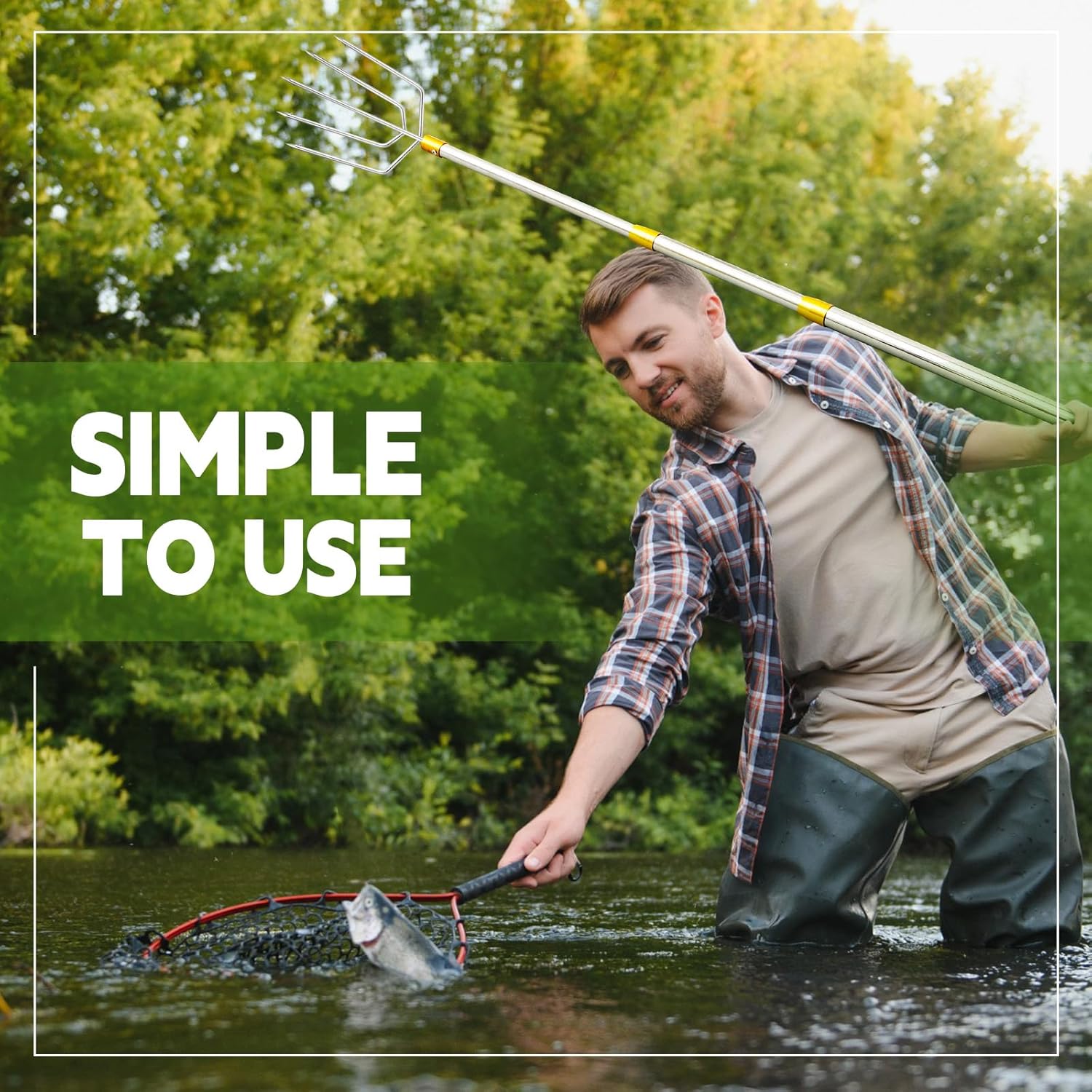 Features: Our telescoping fishing rod stands out due to it easy to install and simple to use telescopic handle design. The innovative design provides you with dexterity, making fishing an effortless and comfortable experience for you. These telescoping fishing rods can serve as a gift for your family members, relatives, friends, colleagues, and neighbors, enhancing your interpersonal relationship. Specifications: Material: stainless steel Color: silver and gold Size: from about 3 ft/ 0.91 m to 9.1 ft/ 2.77 m Package includes: 2 x Fishing spear 2 x Telescoping frog gig pole Notes: Manual measurement, please allow slight errors on size. The color may exist a slight difference due to different screen displays. Pointed items are included, please be careful when using and please keep them away from kids.