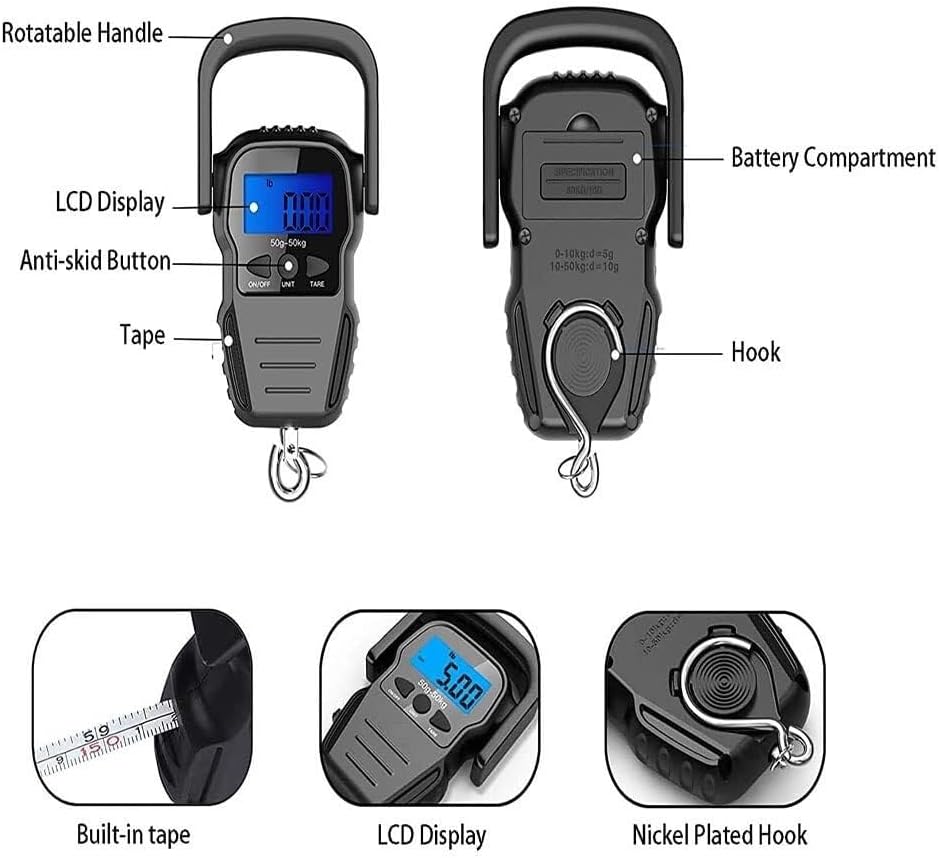 The Fish Scale Hanging Digital Scale is a compact, highly accurate tool that's perfect for all your weighing needs, whether you're fishing, traveling, or shipping. With a capacity of 110lb (50kg), this scale is ideal for measuring both small and large items. Featuring a built-in measuring tape, this scale allows you to measure the size of your fish or luggage as you weigh it. The clear LCD display, equipped with a blue backlight, ensures easy reading even in low-light conditions.This digital hanging scale is designed for comfort and convenience, featuring a durable ABS rubber-coated handle that allows you to hold it securely without discomfort. The 360° rotating stainless steel hook ensures you can weigh items of various shapes and sizes with ease. The scale also comes with a waterproof bag, making it perfect for outdoor use in all weather conditions. Whether you're fishing, traveling, or just need a reliable scale for everyday use, this digital scale has you covered.Key Features:Capacity: 110lb (50kg)Graduation: 10g (0.02lb)Unit options: LB (pounds), OZ (ounces), KG (kilograms)Measuring tape: Built-in 1-meter tape measureDisplay: Blue backlit LCD for clear readings, even at nightHandle: Rubber-coated ABS for comfort during useHook: 360° rotating stainless steel hookStorage: Waterproof bag for safe storage and portabilityPerfect for:Fishing trips (weigh your catch)Traveling (check luggage weight)Home use (weighing parcels or shopping items)The digital fish scale is the perfect companion for outdoor enthusiasts, travelers, and fishermen, ensuring you can measure weight and size accurately and conveniently.