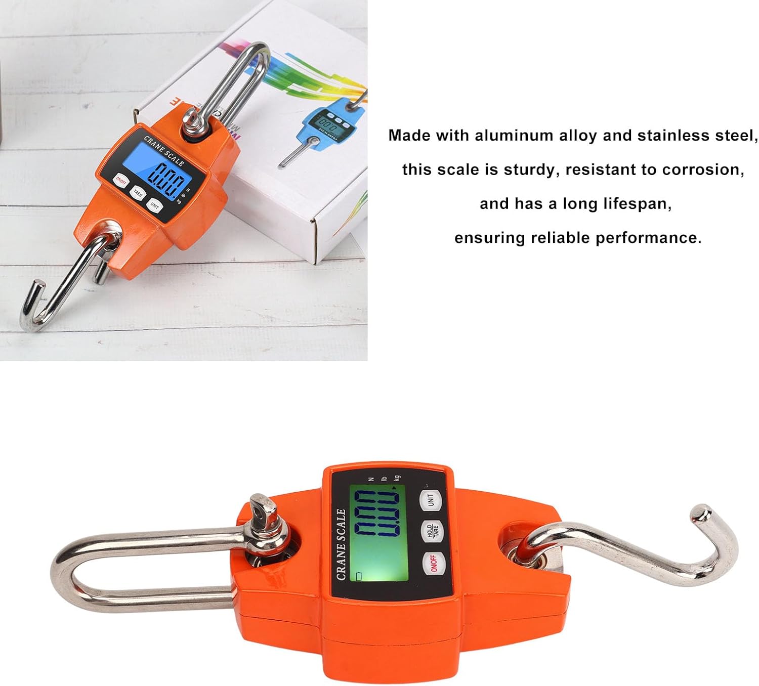 Spec:Item Type: Digital Hanging ScaleMaterial: Aluminum alloy, stainless steelColor: OrangeBattery: AA x 3 (shipped with matching battery)Single Battery Capacity: 500mAhDisplay Screen: LCD backlit display screenRange: 0.3-300kgWeighing Unit: kg lb NPackageList:1 x Hanging Scale1 x Hook1 x Hanging Hook2 x Gasket1 x Safety Pin3 x Battery1 x User Manual
