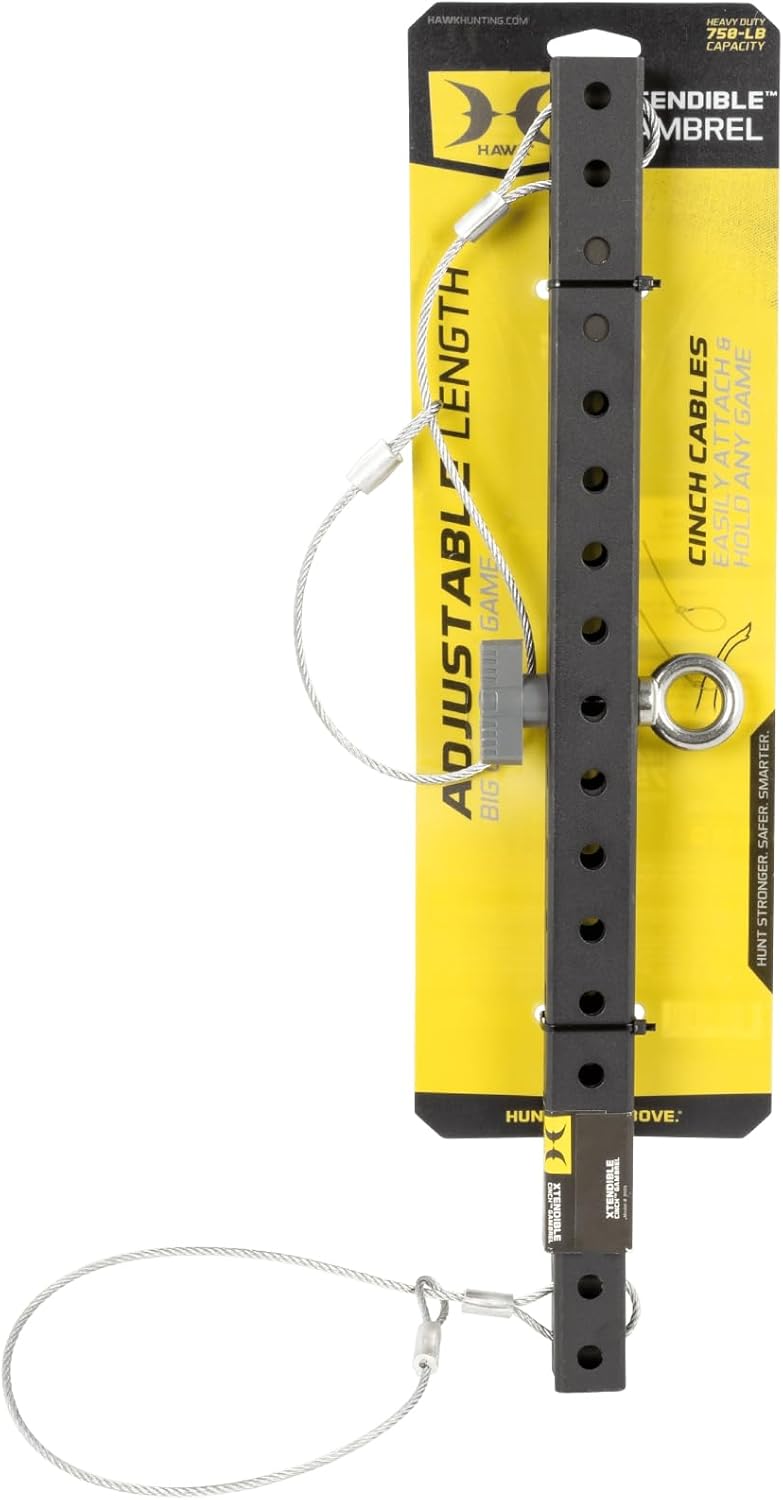 HAWK XTENDIBLE CINCH GAMBREL: Introducing the Xtendible Cinch Gambrel by HAWK, the ultimate adjustable gambrel designed to streamline your game processing experience. With convenient CINCH cables, this gambrel eliminates the need for extra steps and messy cutting holes. Its adjustable length ranges from 16" to 25", accommodating both small and large game, with a weight capacity of up to 450 LBS. The collapsible design ensures compact storage when not in use, making it ideal for hunters with limited space. Crafted from heavy-duty materials, this gambrel is built to withstand rigorous use, offering durability and reliability for all your game processing needs. MAIN FEATURES: - Adjustable Length 16" - 25" Convenient for Small or Big Game; - Easy To Hang Steel Cables Cinch and Hold Game Without Cutting Slots or Other Mess; - Collapses Compact and is Much Smaller Than Traditional Designs; - Heavy-Duty 450 Lbs Weight Capacity. HUNT FROM ABOVE HAWK's industry-leading technology brings the safest and most comfortable Hang-on/Lock-on Tree stands, Ladder Stands, Climbing Tree stands, Climbing Sticks, and some of the most advanced accessories & tools available to hunters today.