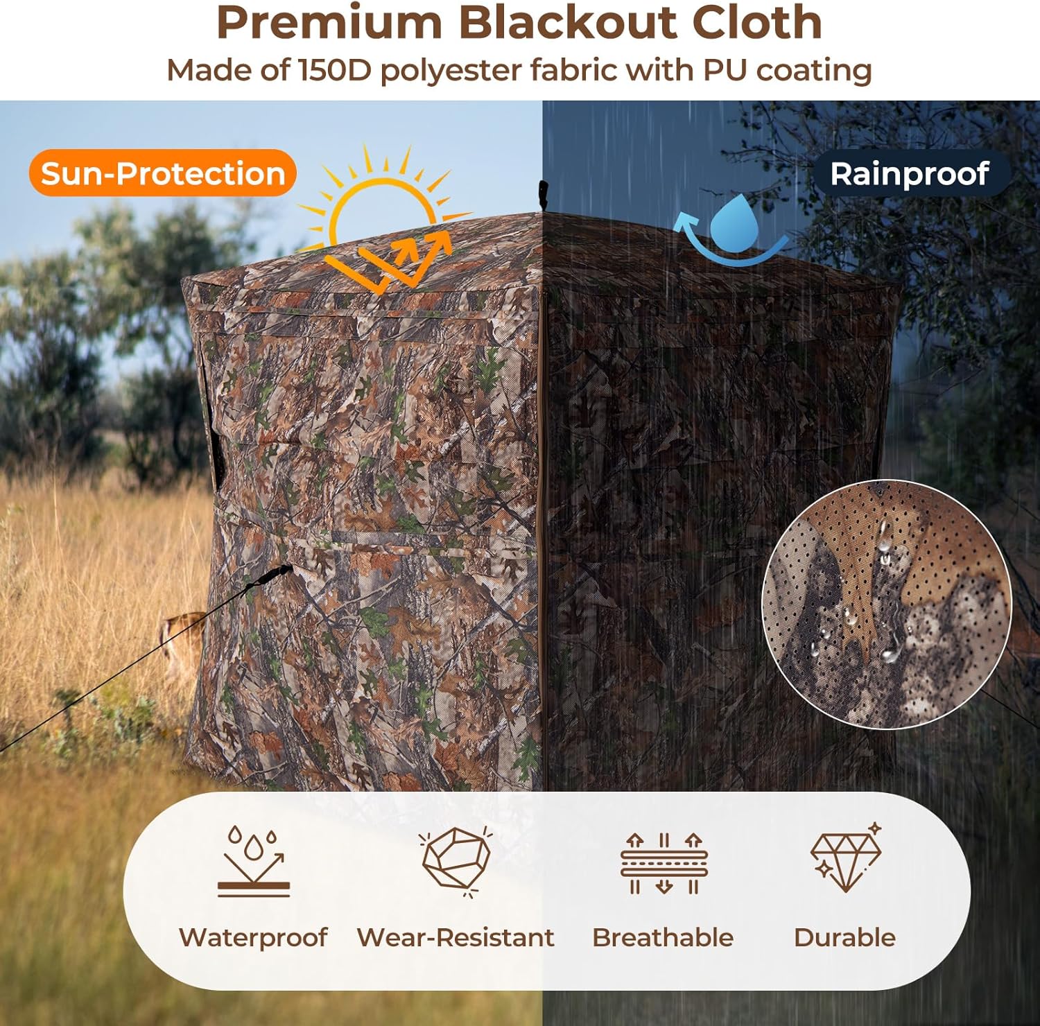 DescriptionElevate Your Hunting Game!This innovative 360 degree see-through hunting blind comes with 4 full panels that provide an unobstructed view, ensuring you never miss a moment of the action. And the blackout cloth panel is crafted of PU-coated polyester fabric, which is not only sun-protection and rainproof, but also breathable to keep inside cool and comfy. And the tent with wind rope and stake fixation ensures good stability and security in various outdoor conditions. Besides, there are 4 large windows with silent zippers to avoid startling prey when opening or closing the windows, along with camouflage patterns and brush-in loops for added concealment. And it adopts a large full-open door, making moving hunting gear and carts a breeze. Thanks to its pop-structure, you can easily set up or take down this tent in minutes by pulling or pushing rings. Also, it is designed with a portable carrying bag, thus you can take it anywhere you want.FeatureBoasts 4 full one-way see-through panels, provide unparalleled 360 degree visibilityComes with 4 large windows, provide the perfect vantage point for a successful huntThe windows with silent zippers prevent startling your preyCamouflage patterns and brush-in loops for concealment in natural surroundingsSpacious interior can hold 2-3 hunters, ideal for both bow and firearm huntingFeatures a large full-open door for easy access for wheelchair users or equipmentWith a convenient pop-up structure, easy and quick to set up or take down the tentThe carrying bag makes storage and transportation convenient for your huntingCan be secured by wind ropes and stakes, not easy to wobble in windy conditionsMade of 150D polyester fabric with PU coating, provide good sun and rain protectionThe smooth double-sided zippers allow for easy access to get in and out of the tentSpecificationColor: CamouflageMaterial: 150D Polyester Fabric with PU CoatingOverall Dimensions: 84” x 84” x 67” (L x W x H)Floor Area Size: 58” x 58” (L x W)Size of the Door: 58” x 56.5” (L x H)Carrying Bag Size: 43.5” x 8” x 8” (L x W x H)Accommodate: 2-3 PeopleNet Weight:15 lbsPackage Includes:1 x Hunting Blind1 x Accessory Bag1 x Carrying Bag8 x Ground Stake4 x Wind Rope1 x User’s Manual