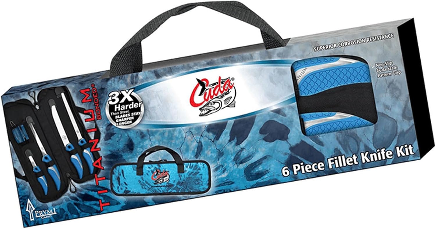 CUDA 6 PIECE FILLET KNIFE SET: The Cuda 6 Piece Fillet Knife Set has everything you need for any sized catch. Each knife features a titanium bonded blade, visible full-tang construction, and the iconic Cuda scale pattern non-slip grips. The titanium bonding of each blade ensures that it is 3x harder than untreated steel, providing exceptional edge retention while also creating a bulwark against corrosion and rust from exposure to the elements. To compliment each blade, the full-tang constructions, and non-slip grips also allow you to wield each knife with a firm precision rivaled by few. Complete with a knife sharpener and heavy-duty Prym1 case for secure storage, there will be few fillets that cannot be made with the help of the comprehensive 6 Piece Fillet Knife Set. SET INCLUDES: - 2.5" Ti Bait Knife (18834); - 6" Ti Fillet Knife (18831); - 7" Ti Wide Fillet Knife (18090); - 9" Ti Fillet Knife (18832); - Knife Sharpener; - Prym1 Heavy Duty Case. MAIN FEATURES: - Two Sharpeners In One 1. Carbide for Heavy Duty Sharpening 2. Ceramic for Fine Tuning Edge; - Freshwater and saltwater use. Cut, Fillet and Sharpen With One Kit!