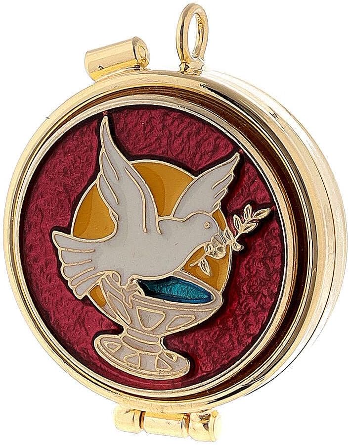 Sick call set has chamois leatherette case and snap fastener. This Sick call set comes with: - enameled pyx 4.5 cm diameter (1.77 in), - sprinkler, - small cross, - oil stock, - purificator, - stole. Weight: 1.00 g - Article Size: Height: 9 cm|Depth: 3 cm|Width: 13 cm - Article Materials: leatherette, metal, fabric - PRODUCT CODE: VC000005
