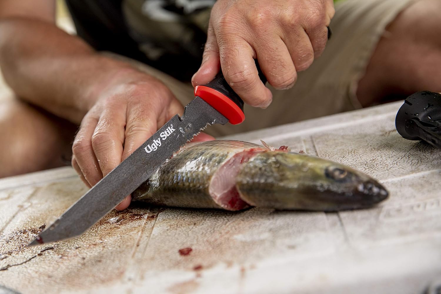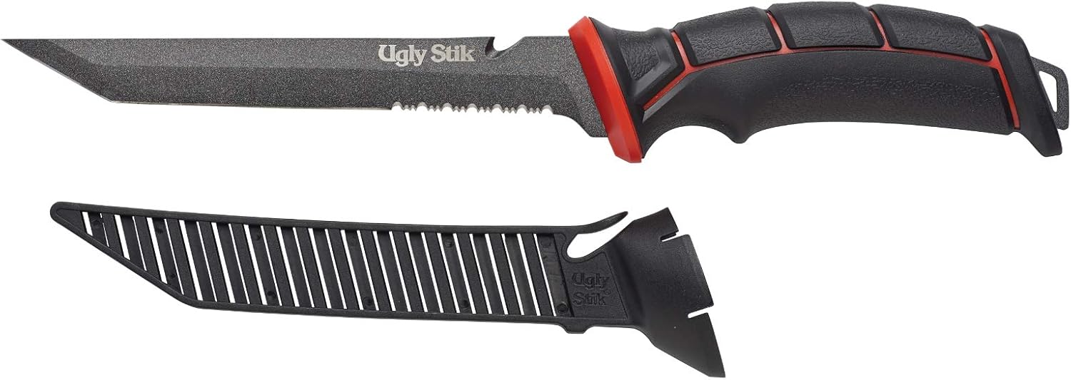 Designed with the angler in mind, the Ugly Stik Ugly Tools Utility Fixed Blade Fishing Knife is a highly capable and valued companion for any fishing belt or tackle box. It features partial serration, a straight and stiff tanto blade, and a handy line cutter that works well with monofilament and braided line alike. And with a convenient lanyard hook, signature red and black Ugly Tuff grips, and precision 8Cr14MoV stainless steel construction, it's right at home on the water or in your house or boat. Fishing has gotten too pretty. Unscratched sparkle barges with nuclear-powered engines. Rods that act like skittish thoroughbreds instead of unshod workhorses. Fish pictures taken for 'likes' instead of refrigerator doors. It's time to fish the way it's meant to be done, with tough, durable tackle built to provide ten whopper fish pics for every one of some dandy holding a fancy rod and a fingerling. It's time to fish ugly.