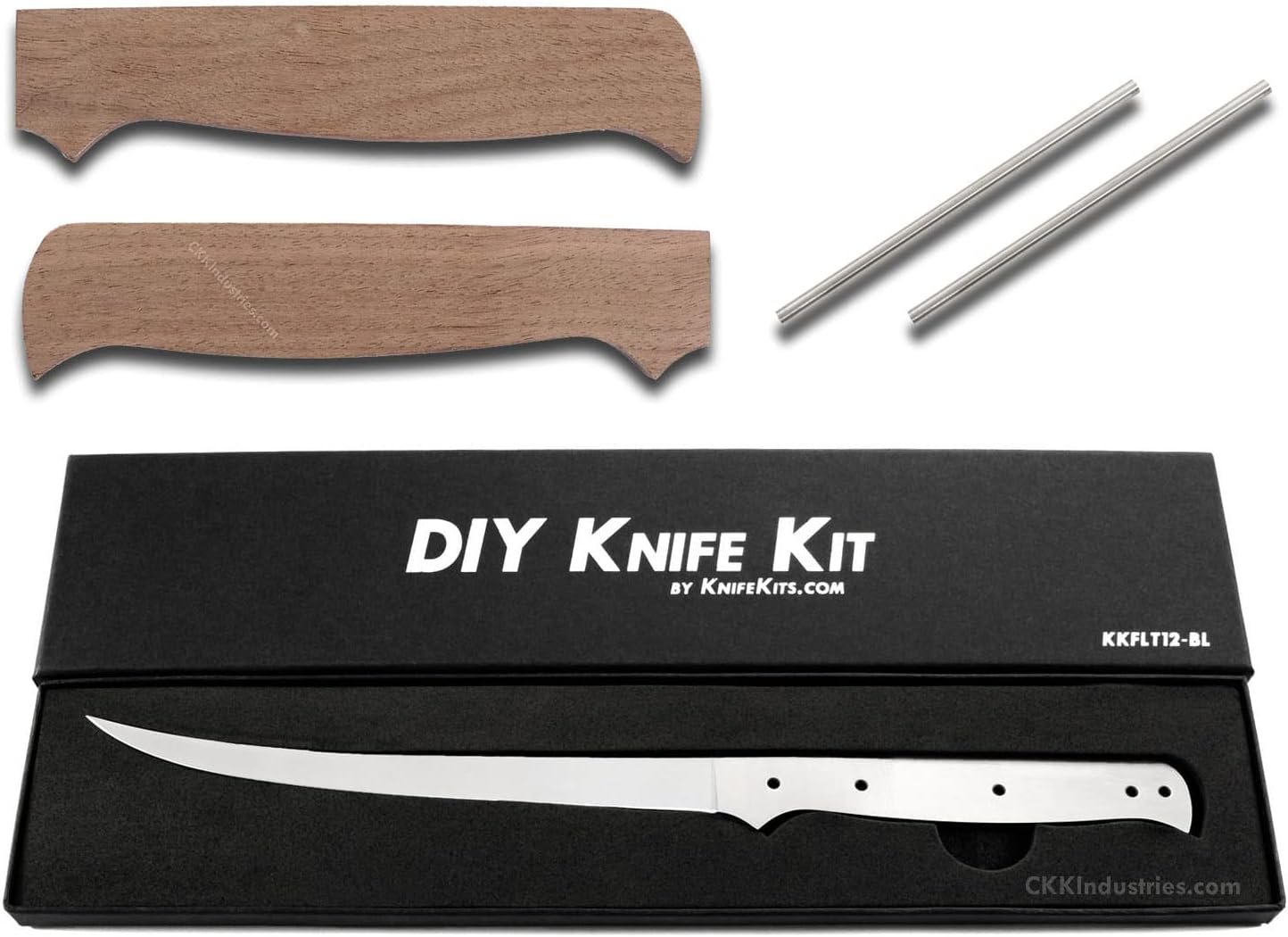 The Fisherman's Filet is our big boy filet knife kit. This filet knife blank design is 12 inches overall with a 7 inch ultra-flexible blade. This fish filet knife kit model makes small work of filet cuts and is very easy to handle and control. This version is the combo knife kit. It comes with the Fisherman's Filet blade blank plus pre-machined Padauk handle scales and stainless steel pinstock to simplify the completion process. Add a touch of proper finishing and create a fabulous custom fishing filet knife that you'll be proud to own and use. 0.126 inch stainless steel handle pinstock is included with this kit. For optional handle pin treatments, use any 1/8" (0.125 in) diameter pinstock, mosaic pins, or handle fastener products. General Kit Specifications Fisherman's Filet Combo Kit Skill Rating: Level III Blade Steel: AUS8 Stainless Steel (Cryo-Treated for Optimum Blade Performance) Blade Finish: Satin Blade Length: 7 Inches Overall Length: 12 Inches Blade Width: 0.675 Inch Thickness: 3/32 Inch Tang Holes: (5) 0.126 Inch Handle Pinstock Included: Yes (Stainless Steel) Handle Material Included: Yes (Padauk - pre-machined)