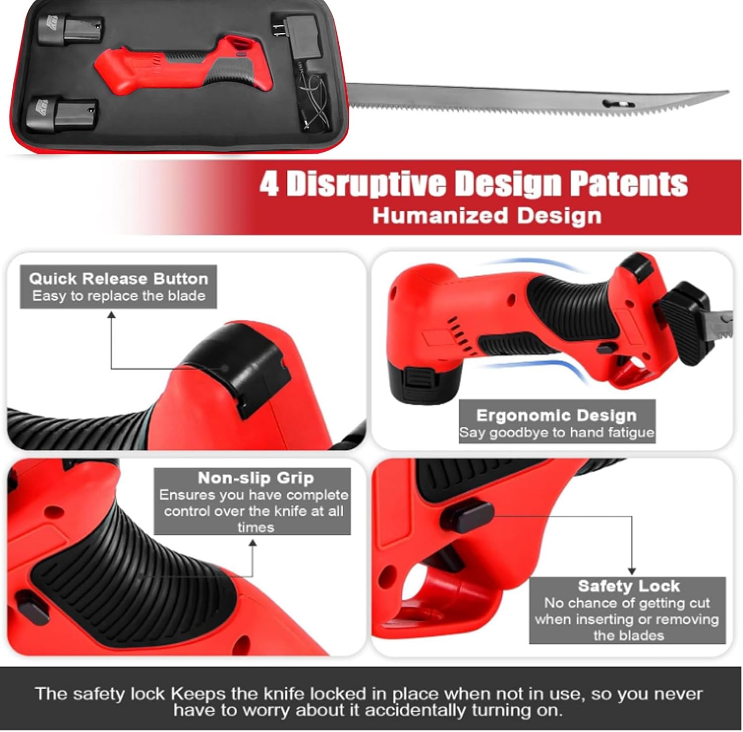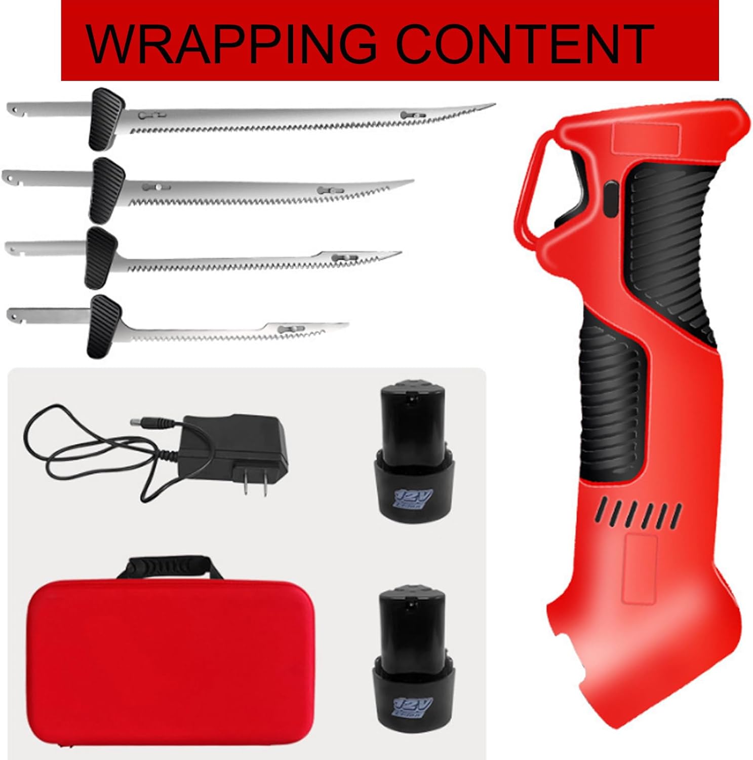 FEATURE1:The best part of all is it's electric & cordless!2:4 stainless steel blades coated.So you can choose the appropriate blade to handle according to the size of the fish.3:2pcs Rechargeable Li-ion Battery4:Quick Release Button works great, easy to eject the blades with a push of a button.5:Non-slip Grip -The ergonomic design provides a comfortable grip and reduces hand fatigue. and it fits comfortably in your hand and has a non-slip grip.6:Safety lock feature keeps the knife locked in place when not in use, so you never have to worry about it accidentally turning on.PACKAGE CONTENTS1* Machine body4* Blade2* Battery1* Charger1* Storage box