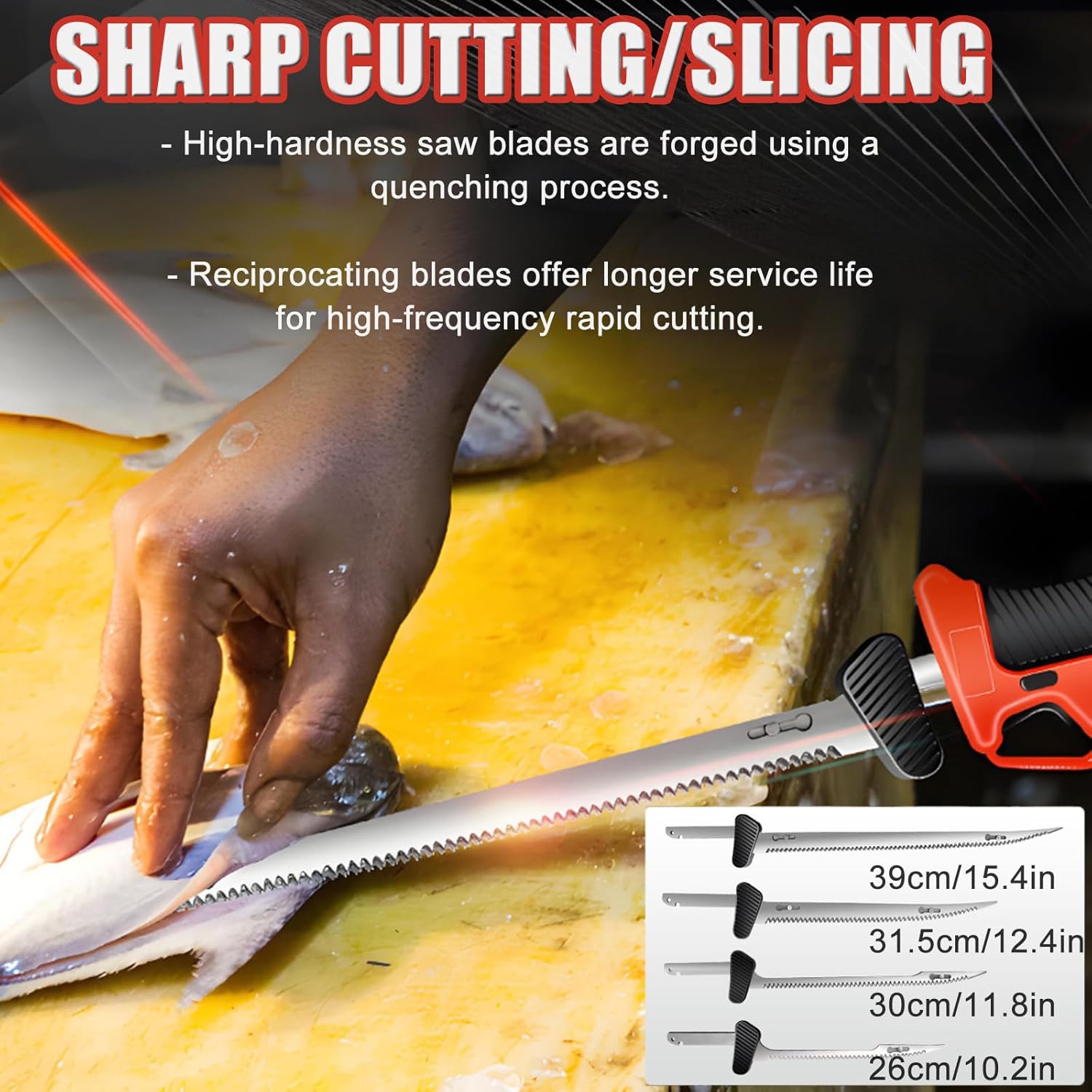 Are you still cutting meat manually? 2026 upgraded cordless electric fillet knife—your ultimate partner for effortless fish cleaning and food preparation. Designed for anglers, home cooks, and professionals alike, this rechargeable fillet tool delivers total cord-free freedom. With 4 specialized blades, two long-lasting batteries, built to handle everything from tough fish bones to poultry and meat with pro-level speed and precision.Features:1. Total cordless design for use anywhere, from the kitchen to the boat.2. Four professional blades easily cut through tough fish bones and thick meat.3. Two rechargeable batteries provide up to one hour of continuous runtime.4. Get a full charge in just 50 minutes for minimal downtime.5. The non-slip ergonomic grip ensures safe and comfortable control.6. A built-in safety lock prevents accidental activation7. Versatile electric knife for filleting, scaling, and slicing meat or poultry.Specification:Name: E-fish Fillet knifeBlade material: Carbon steelBlade size: 26cm/10.2in30cm/11.8in31.5cm/12.4in39cm/15.4inTilt angle: 60° or higherBattery capacity: 2000mAhBattery life: 1 hourCharging time: 50 minutesBody weight: 0.65kgpacking list:1x Electric reciprocating cutting knife4x Blades2x Batteries1x Charger1x Storage Case1x Instruction manualIf you have any questions about Electric reciprocating fish fillet/meat Cutting equipment, please send us an Amazon email and we will resolve your issue within 24 hours.