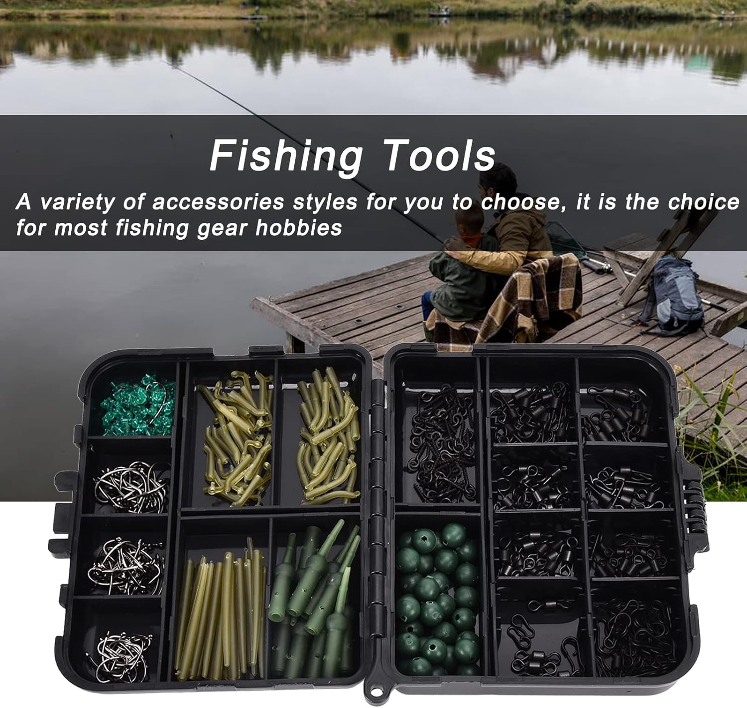 Item Type: Fishing Tackle KitMaterial: Plastic, Rubber, Stainless SteelColor: As Pictures ShownWeight: Approx.165g/5.8ozPackage List:40 x Boilie Bait Screw40 x Link 60 x Fish Hook70 x Sleeve30 x Soft Fishing Beads 80 x Rolling 100 x Accessories1 x Storage Box