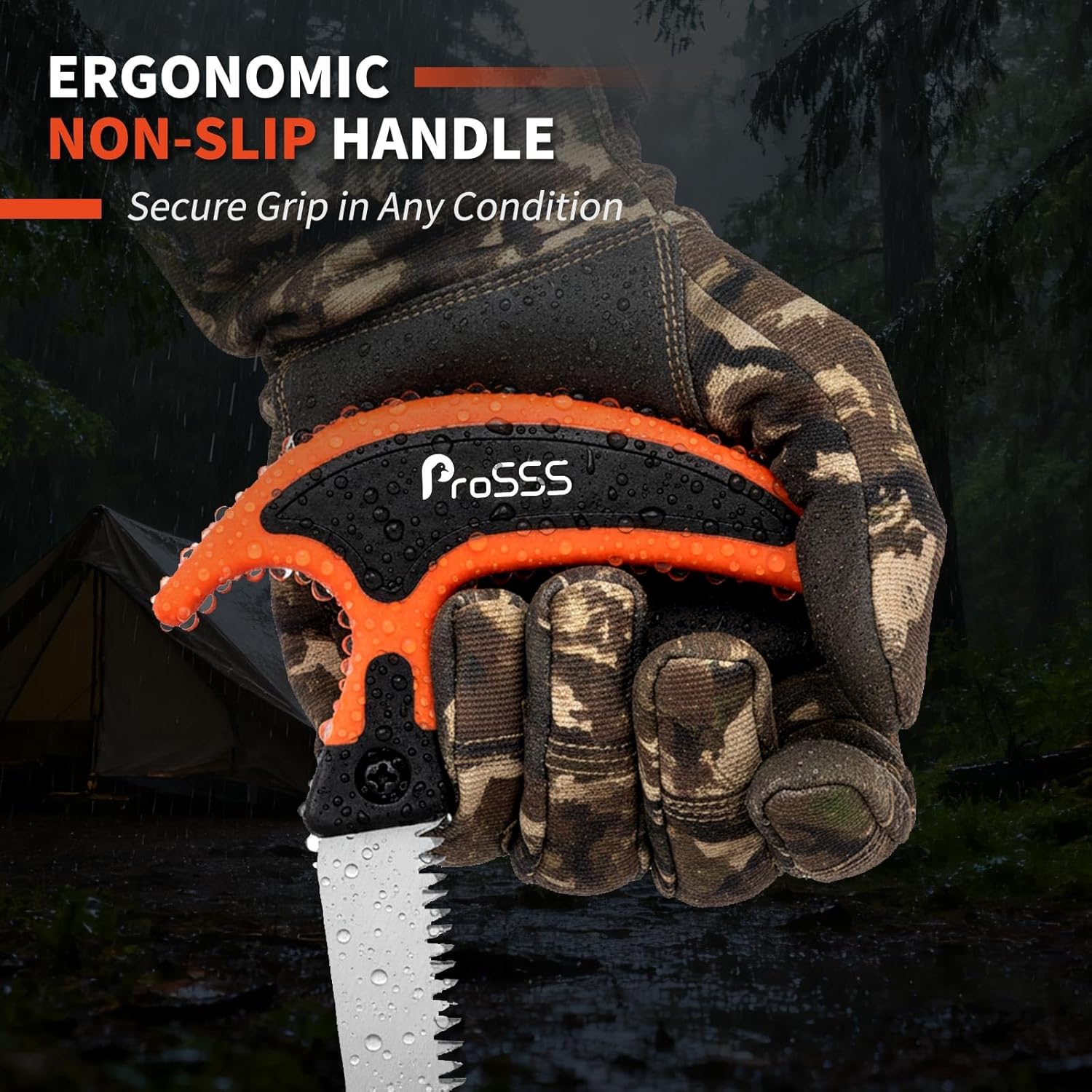 ProSSS Hunting Bone Saw with Replaceable Blade, Compact Meat Saw for Hunting, Camping & Survival, Cuts Bones, Meat and Branches with Ergonomic Handle and Belt Sheath [Upgraded 65Mn Hardened Blade] : Crafted from high-strength 65Mn steel with quenching technology, this bone saw delivers outstanding hardness and durability. Sharp saw teeth easily cut through bones, meat, and branches, perfect for hunting, camping, or outdoor survival. [Replaceable Blade with Spare] : Designed for convenience and longevity, the blade can be removed and replaced when worn. Includes one spare blade to ensure reliable performance for long-term hunting or meat processing. [Ergonomic Non-Slip Handle] : Built with an ergonomic grip that prevents slipping, this hunting saw provides excellent control and comfort even in wet or cold conditions. Ideal for game processing, cutting meat, or trimming wood in the outdoors. [Portable Belt Sheath] : Comes with a durable belt sheath for secure storage and hands-free portability. Easily attaches to your belt or backpack for quick access during hunting, camping, or survival adventures. [Lightweight & Multi-Purpose] : Measuring 6.5” x 4.5” with a 4” blade and weighing only 0.095 lb, this compact saw is lightweight yet powerful. A versatile outdoor tool for bone sawing, meat cutting, and wood branch trimming.