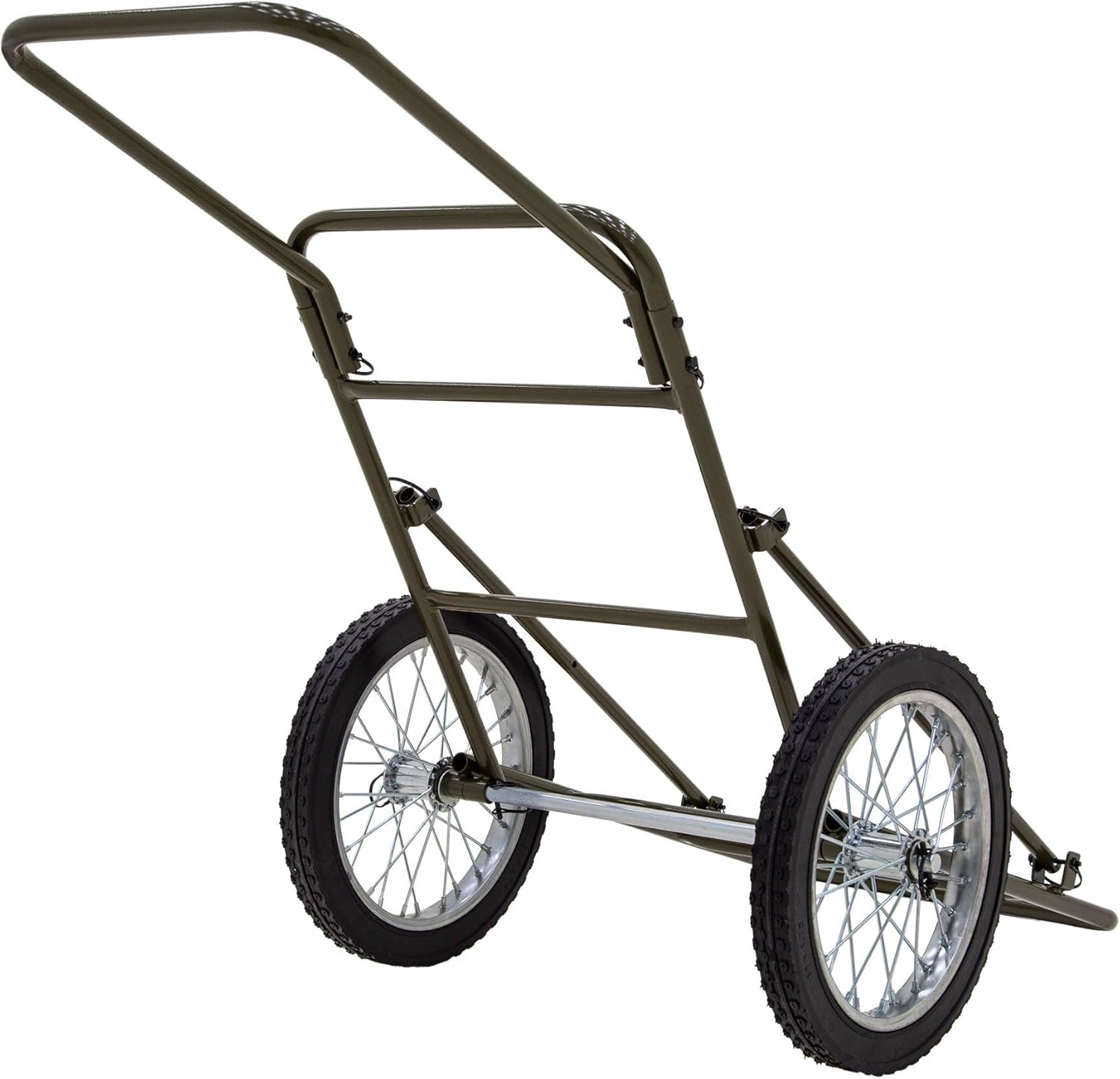 The Kill Shot Folding Game Cart saves time and energy on your hunting trip by making it easier to haul up to 500 lbs. of gear or game through the woods. You'll be able to transport tree stands, hunting gear, extra ammunition and other essentials over rough terrain with two 16" wheels and an extended handle. Manufactured from brown powder-coated steel, this cart folds up to save space in your vehicle or garage.