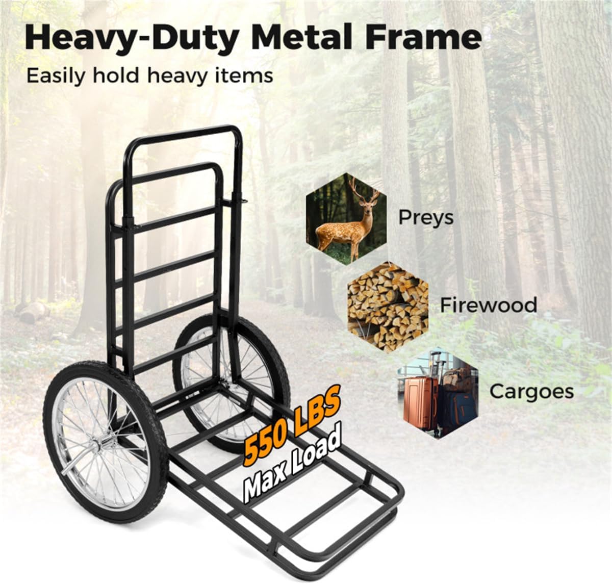 ● 2-Level Adjustable Game Cart: This game cart offers a versatile 2-level adjustment with a locking latch. Users can set the deer cart upright or lay it flat based on specific needs, making it ideal for a variety of outdoor tasks.● Unique Double-Layer Structure: Unlike normal game carts, this cart features a double-layer design that securely holds your game in place on the upper deck, preventing it from falling off during transport.● Heavy-Duty Metal Frame: Crafted from high-quality metal, this deer cart is built to easily hold heavy items with weight capacity of up to 550 lbs. Whether loading preys, firewood or cargoes, this hauling dolly will always be a perfect choice.● Firm and Smooth Movement: This robust game cart is equipped with two 20-inch rubber wheels that are non-slip, wear-resistant and puncture-proof. Therefore, the cart can move across different terrains including grass, sand, gravel and snow.● Not Just a Deer Cart: Far beyond just hunting or transporting deer, this versatile cart is perfect for a range of outdoor activities like camping. The deer cart also doubles as a hitch-mounted cargo carrier for vehicles. Note: Receiver tube is not included.Specifications:Color:BlackMaterial:MetalOverall Dimension:39.5" x 30.5" x 46"Dimension in Flat:62" x 30.5" x 20"Diameter of Wheel:20"Weight Capacity:550 lbsNet Weight:47.5 lbs