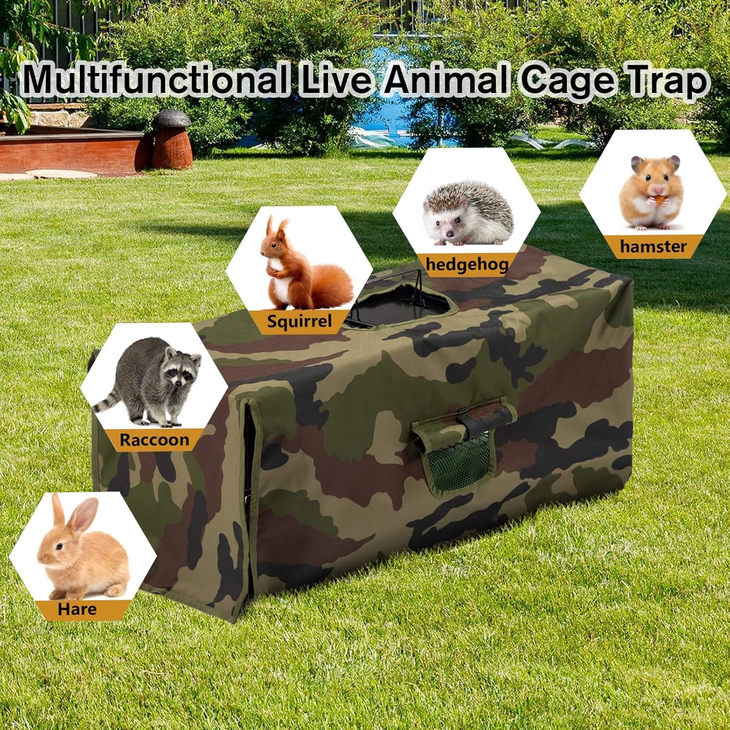 Live Animal Trap Cage with CoverAs urban and wilderness ecosystems intertwine, animals may disturb your life. Our cat trap is a versatile solution for various animals, including cats, raccoons, rabbits, groundhogs, armadillos, and opossums. It effectively addresses issues such as farmland invasion, release, and harassment.Animal Trap Features:Concealed Design Increases Capture SuccessThe included cage cover helps disguise the trap, creating a calm and enclosed environment that encourages animals to enter, increasing trapping efficiency.Protects Trapped AnimalsThe cover provides privacy and shade, offering a more comfortable and secure space for captured animals, shielding them from sun, wind, and exposure.Outdoor-Ready Cover MaterialMade from durable Oxford fabric with PVC coating, the cover is UV-resistant and waterproof, making it perfect for outdoor use in all weather conditions.Windproof & Easy Access DesignEquipped with corner clasps to hold securely in windy environments. The top zipper allows convenient access to the cage handle for easy transport without removing the cover.Humane and Reusable TrapBuilt from strong iron wire mesh, this cage is designed for multiple uses. Its safe and effective structure ensures humane capture without harming the animal.Specifications:1. Animal Trap Dimensions: (32 x 11.5 x 12.5) in / (81.3 x 29.2 x 31.8) cm2. Animal Trap Material: Iron, Mesh Fabric3. Net Weight: 9.3 lbs / 4.2 kgPackage Includes:1 x Live Animal Trap Cage with Cover