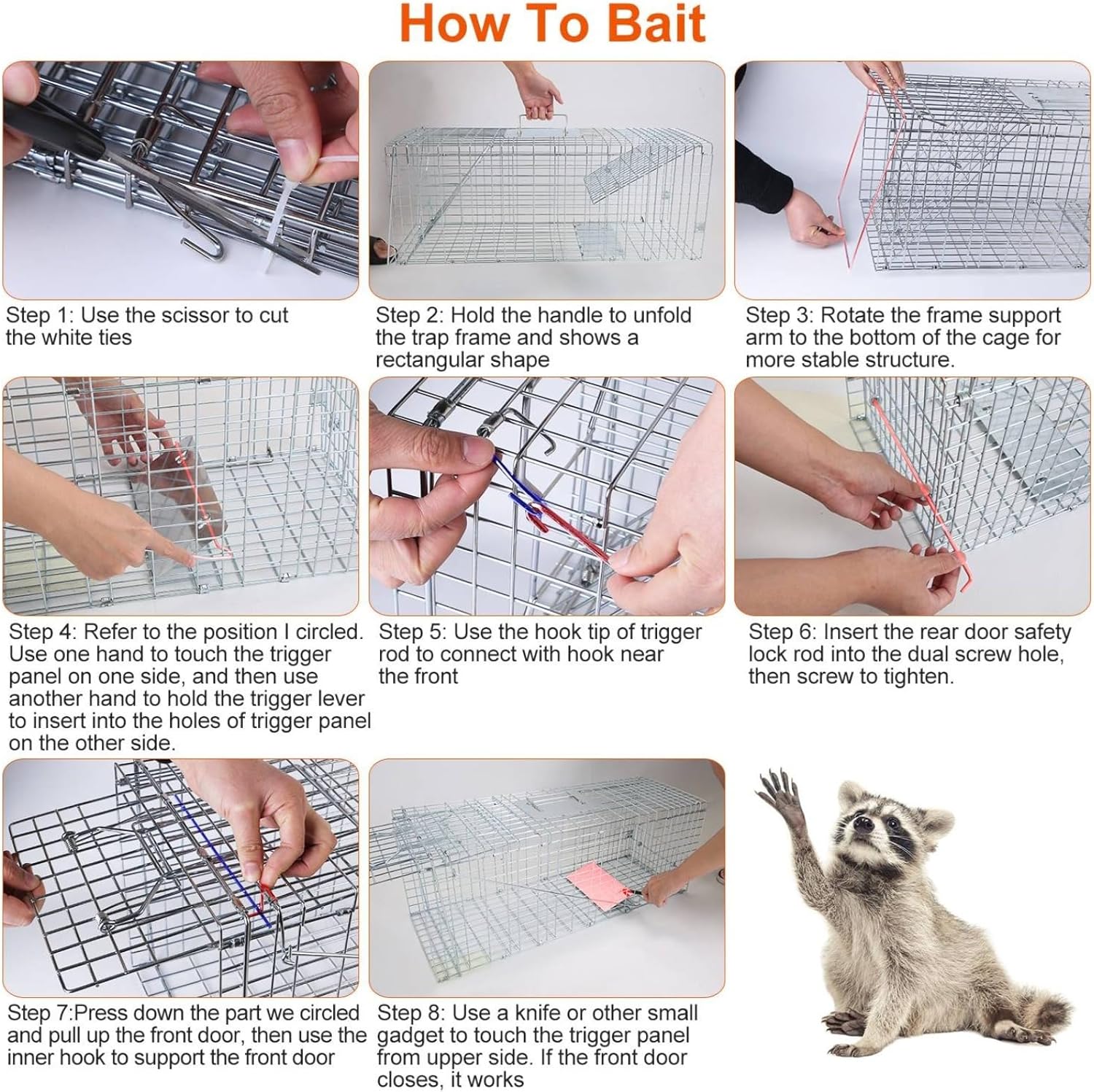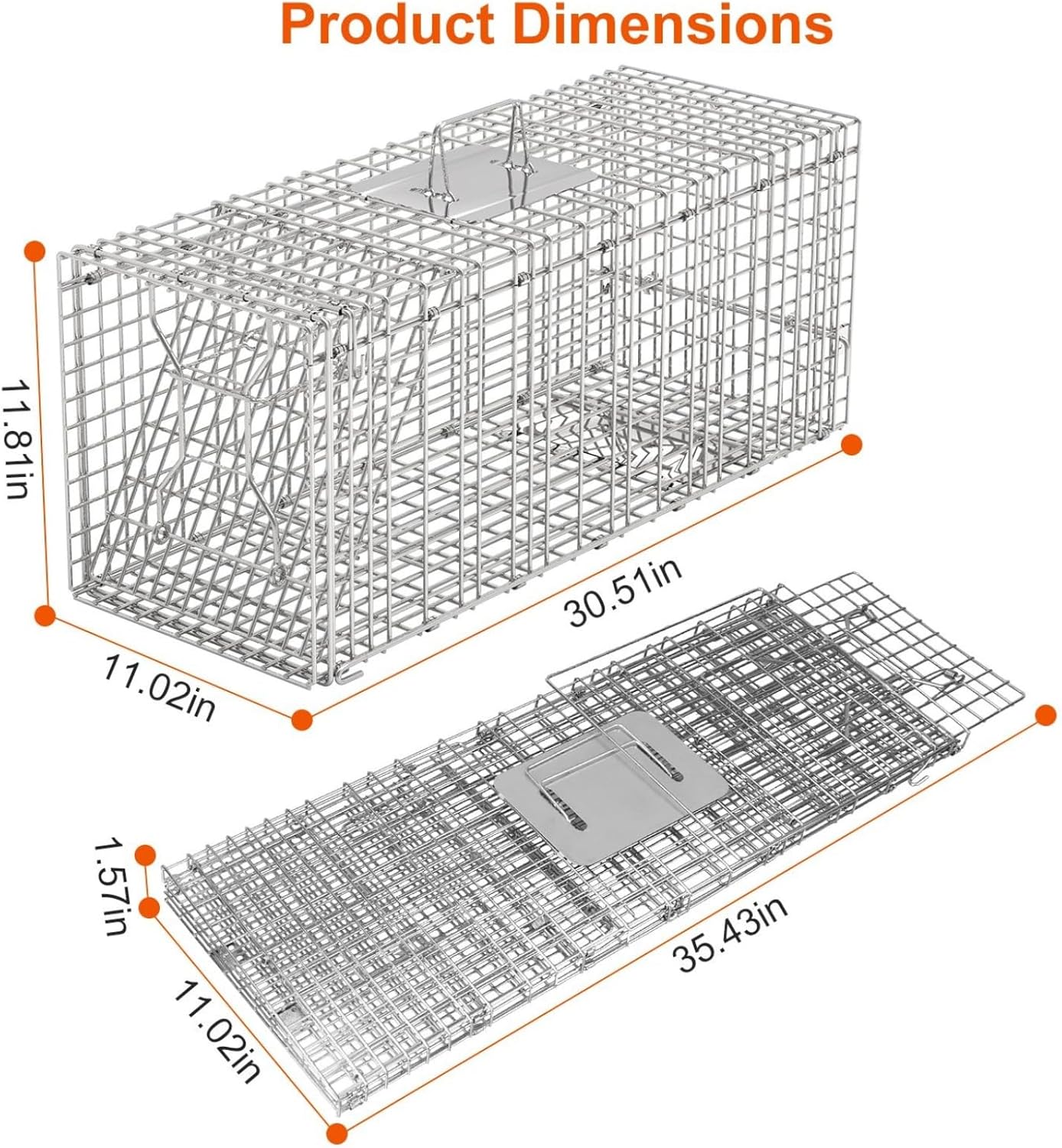 This animal capture cage is intended for use with cats, raccoons, groundhogs, skunks, opossums, small dogs, and foxes weighing under 16.5 lbs. It is constructed from galvanized wire mesh and features a folding design for compact storage and transport. The unit includes a rear door for releasing animals and a front door that closes when the internal pedal is pressed. Dual handles with a side guard plate provide a comfortable grip during handling. Suitable for use in residential yards, gardens, or indoor spaces where temporary animal containment may be needed.