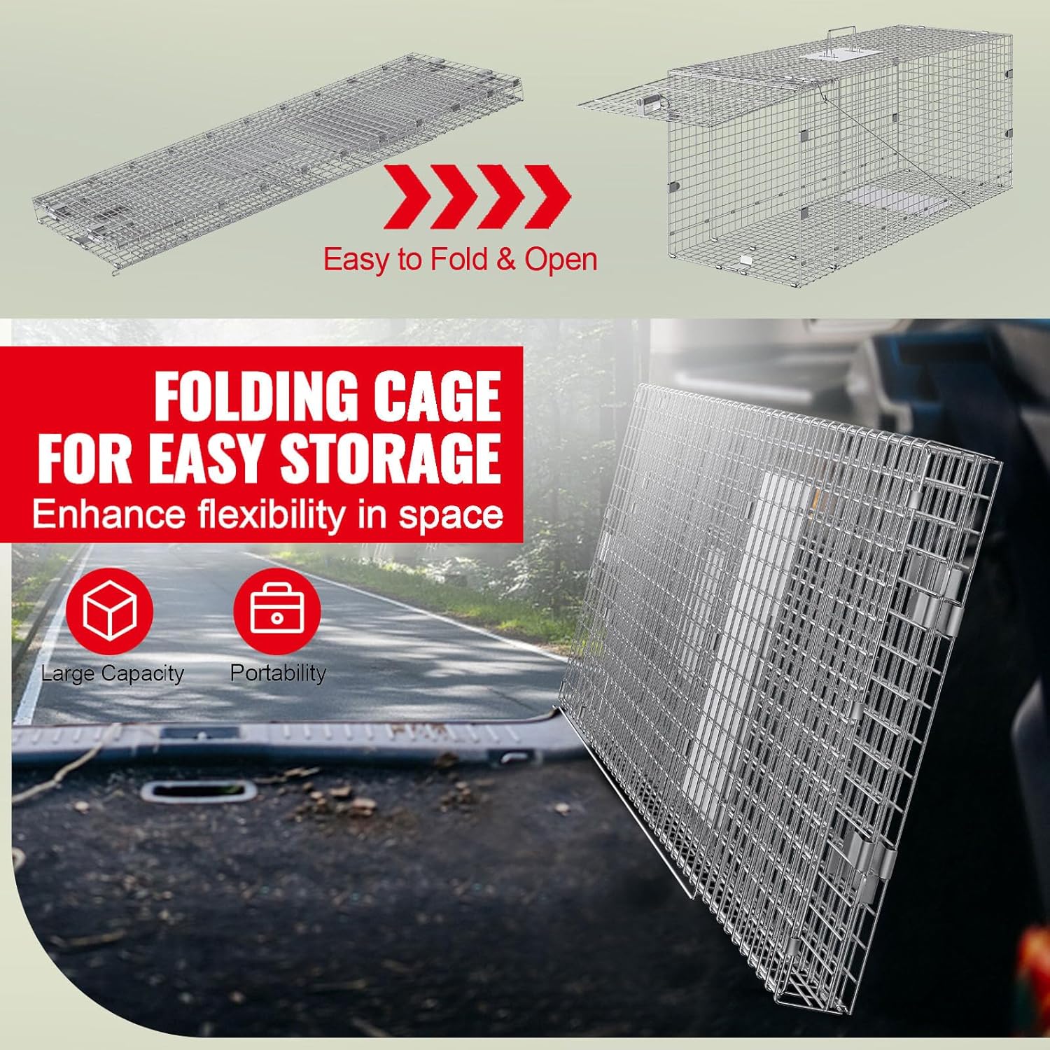 Size: 1067 x 406 x 457 mm / 42 x 16 x 18 inches Net Weight: 9.5 kg / 21 lbs Item Model Number: LB-33A Main Material: Galvanized Iron Wire Mesh Wire Material: Galvanized Iron Wire Pedal Material: Galvanized Sheet Metal with Reinforced Edge Handle Material: Galvanized Iron Wire Door Type: Iron Wire Mesh Door Foldable: Yes Handle: External