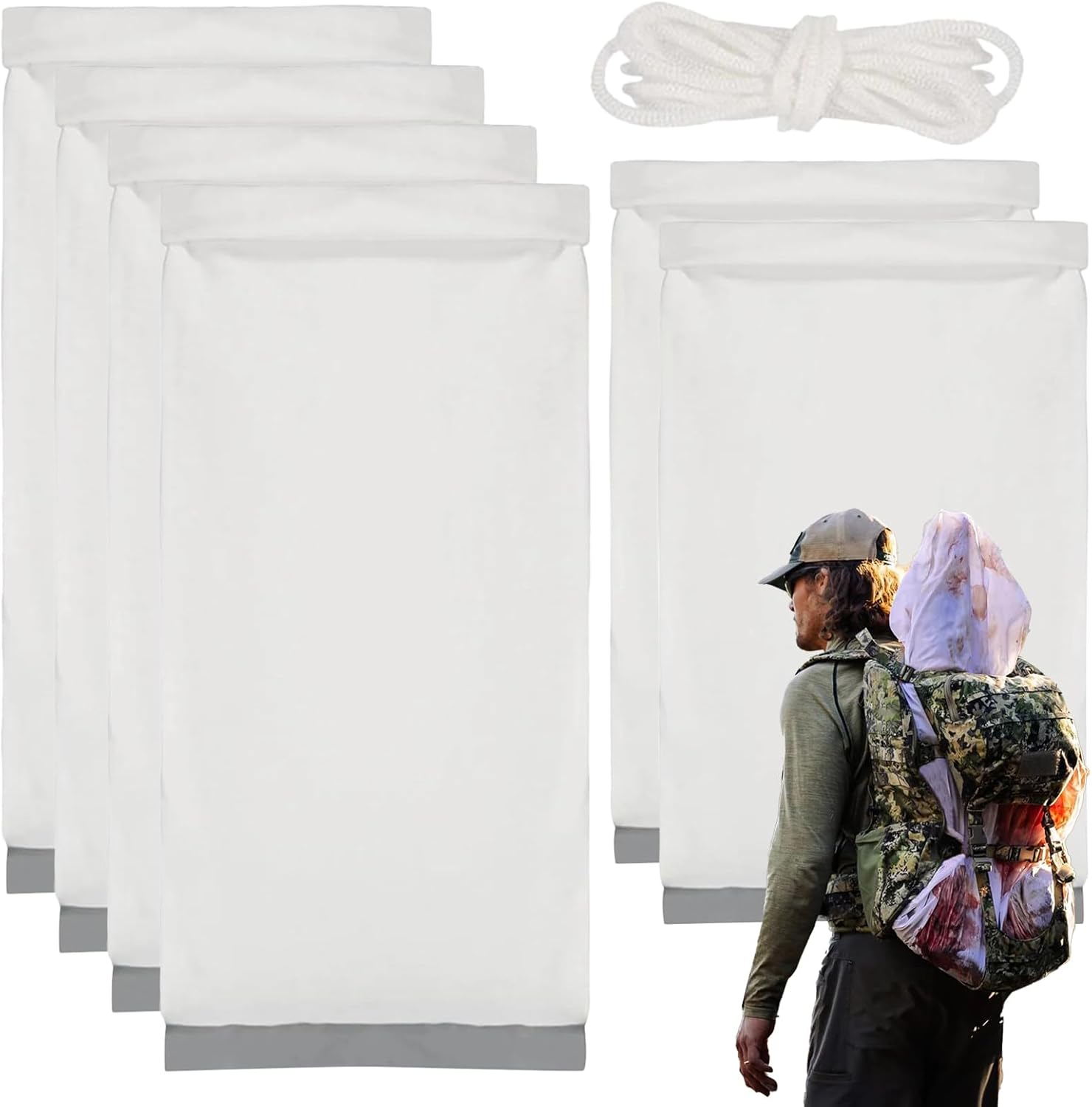 Elk Game Bags | 6X big gam Bags with Reflective Strip - Reusable Wild Game Meat Bags, Hunting Accessories for Elk Caribou Deer MooseOur elk game bags for meat feature a breathable design that promotes air circulation to ensure your harvested meat stays fresh.Specification:Product name: Elk bagProduct size:4 pieces about 30x120cm/11.81x47.24 inches2 pieces about 30x70cm/11.81x27.56 inchesMaterial: PolyesterColor: WhitePackaging size: about 25x35x10cm/9.84x13.78x3.94 inchesWeight: 950gPack List:Elk game bags*6