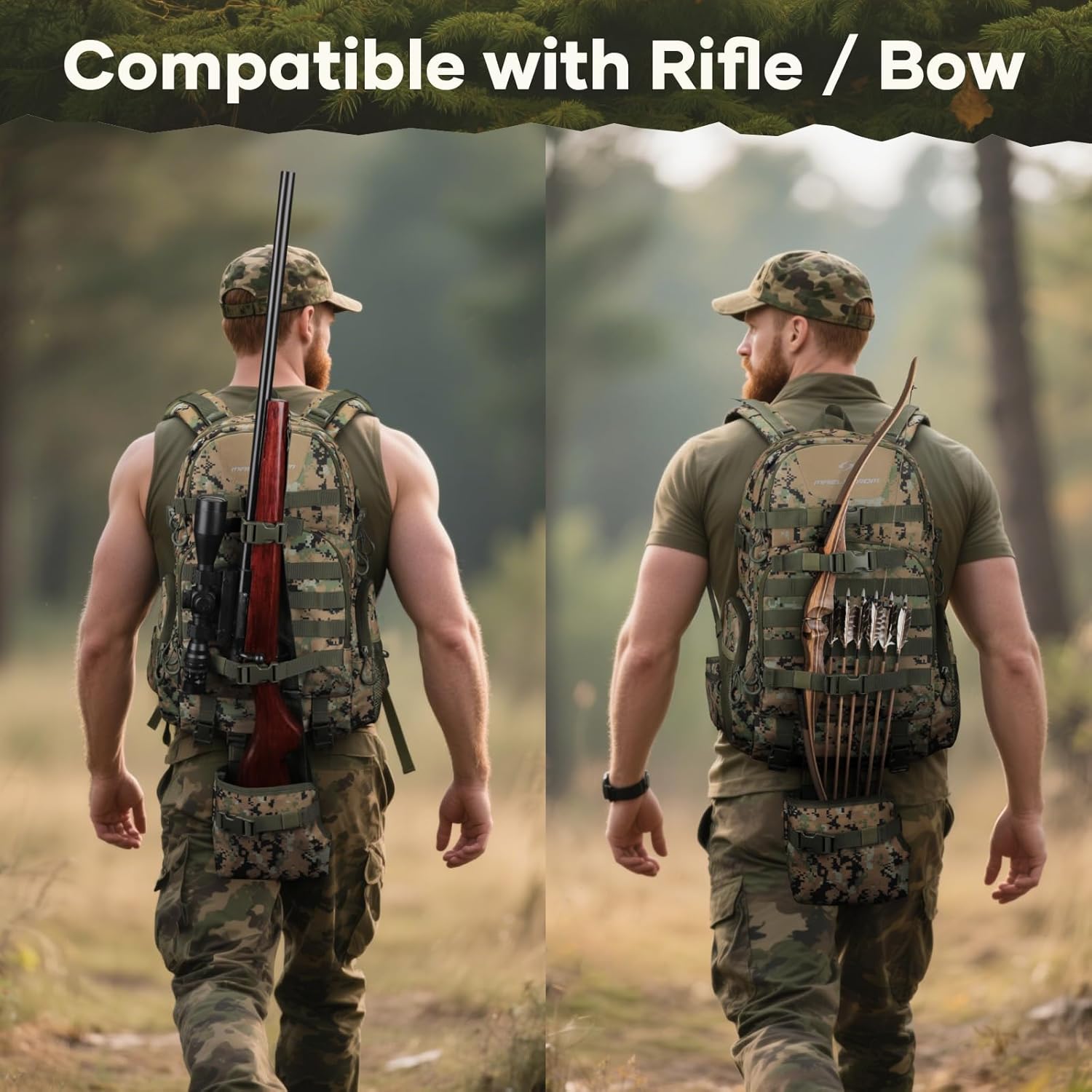 The Maelstrom hunting backpack for men women is a must - have for outdoor enthusiasts. Its durable design, crafted from 900D reinforced polyester , offers ruggedness, quick - dry, and abrasion - resistance. The camo pattern ensures stealth during hunts. Multiple pockets provide massive storage. The MOLLE system lets you attach accessories. Equipped with a rain cover, it offers all - weather protection. The 1cm thick breathable mesh padding on the straps and back ensures comfort. It is perfect for hunting, hiking, and survival adventures.