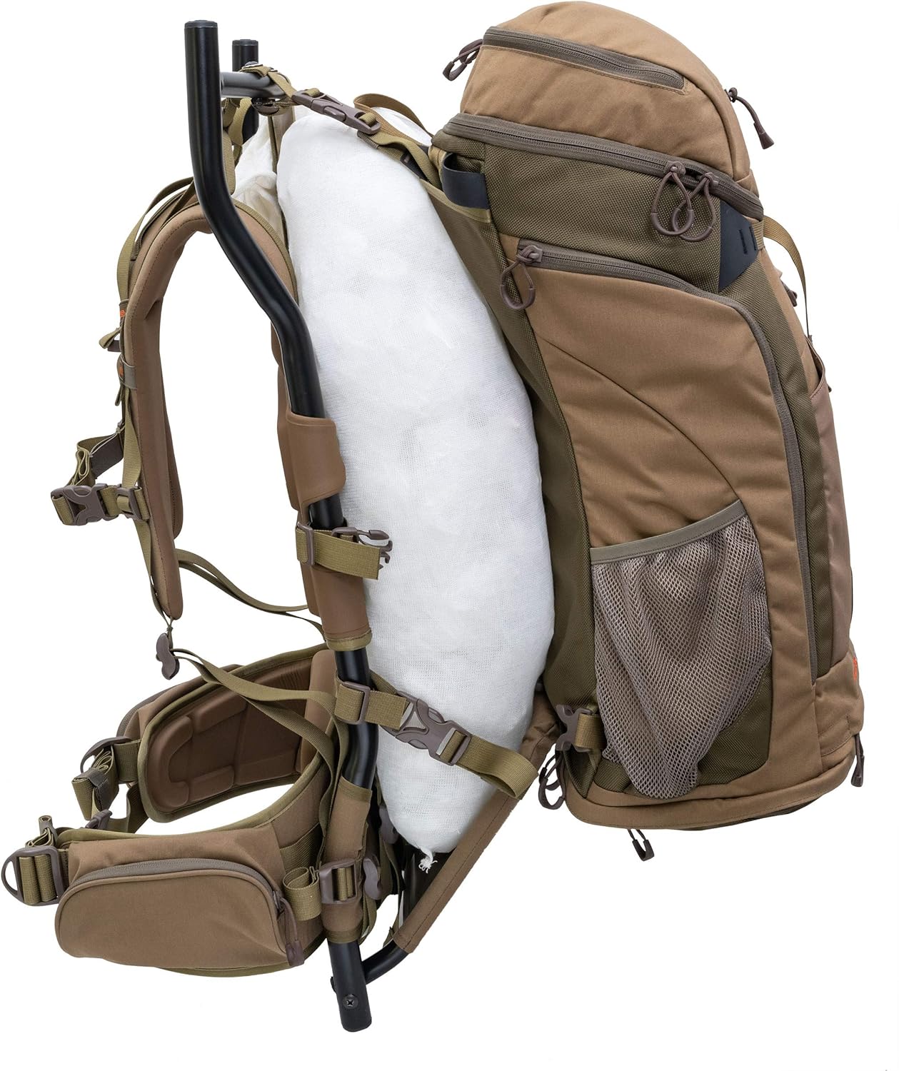The Trophy X + Pack is a complete system for the backcountry hunter. The combination of an external frame meat hauling pack with a detachable 3900 cubic inch pack offers the ability to pack in gear to a camp and haul your meat when the hunt is completed. The pack bag has its own storable shoulder straps for use without the frame. The Trophy X frame has a roll out lashing system and heavy-duty freighter shelf to support heavy loads. The pack bag can then be attached with an included lashing system. The pack can be attached while hauling meat or extra gear. The frame is lightweight powder-coated aluminum and has a Lycra covered molded foam suspension for extreme comfort. The Trophy X is your go-to backcountry hunting pack – ready for any challenge.