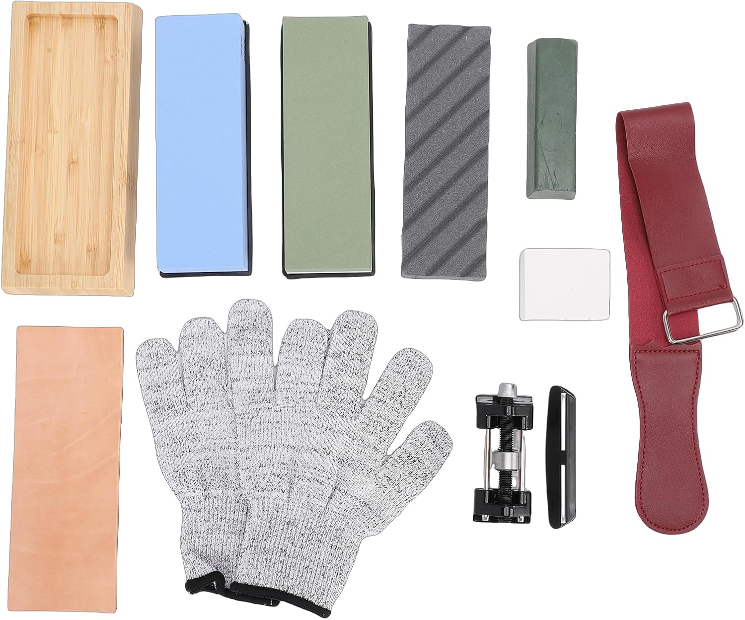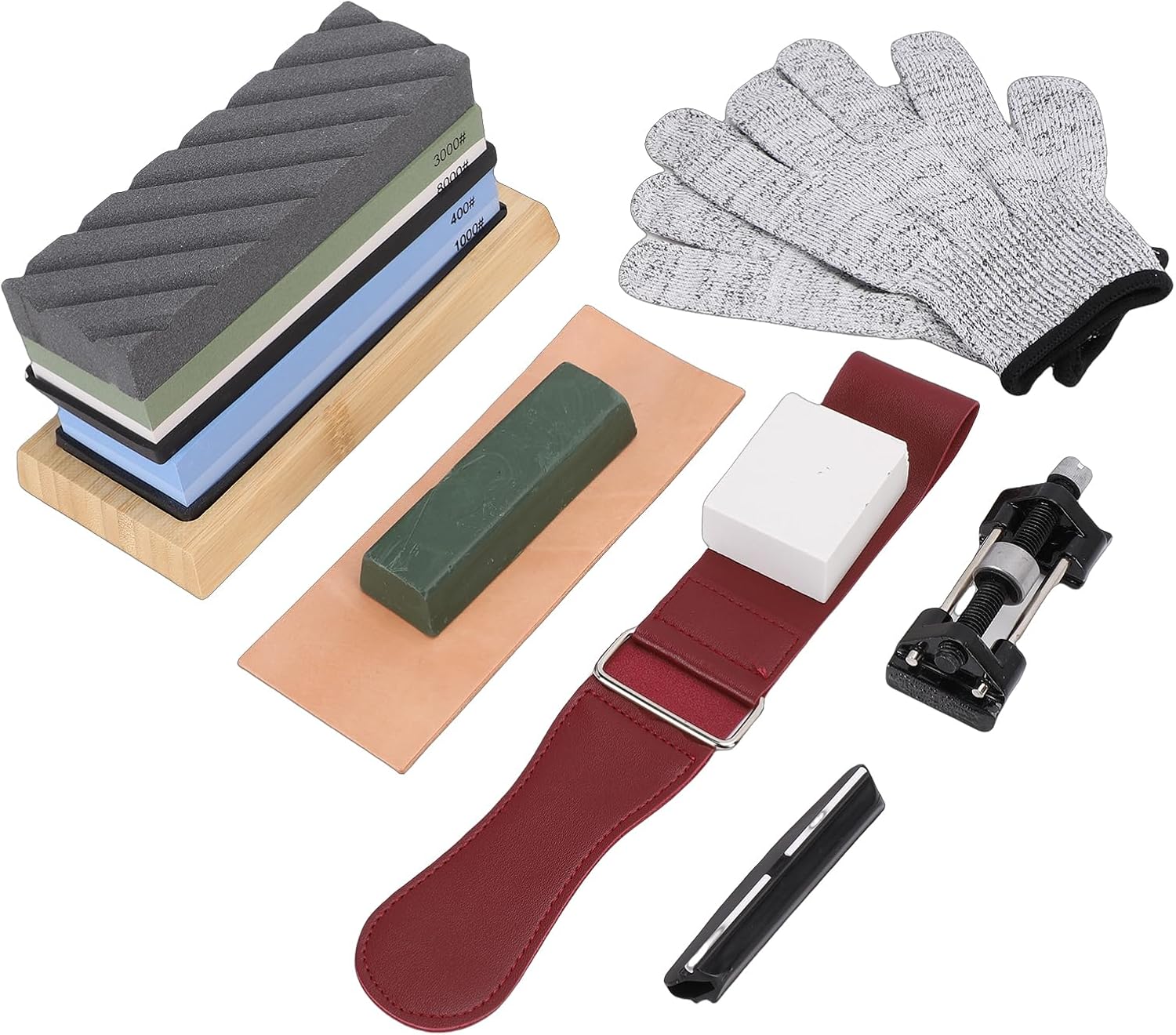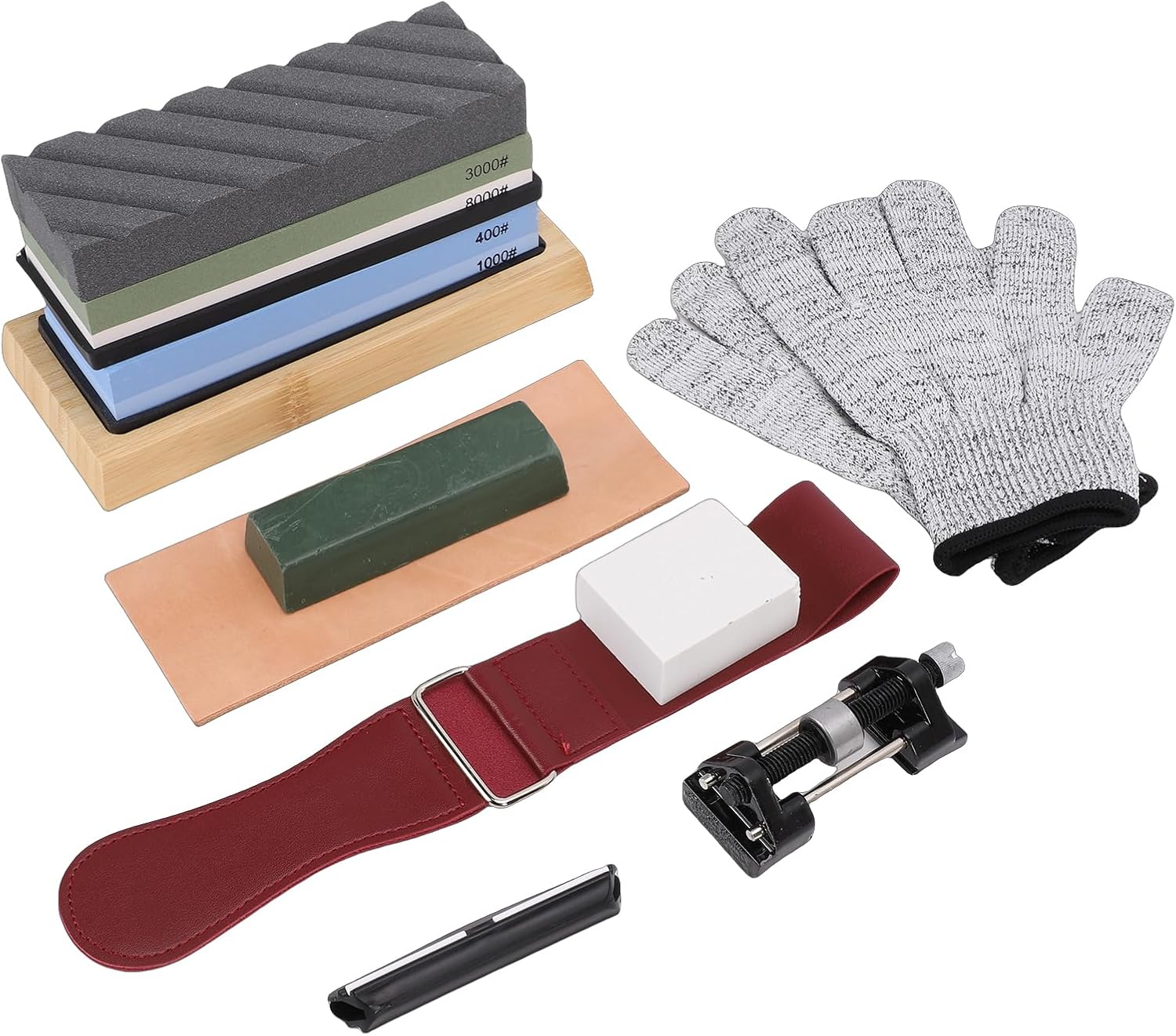 1. [Professional Sharpening Kit]: This whetstone set includes 400, 1000, 3000, and 8000 grit stones to handle all sharpening needs, from repairing damaged edges to achieving a mirror polish. The included angle guide ensures precise sharpening for optimal results. 2. [Safe and Stable Use]: Each knife sharpening stone comes with non-slip rubber bases and a bamboo holder to prevent slipping during use. The ergonomic design enhances safety and efficiency, making food preparation easier with well-maintained blades. 3. [Versatile Application]: The sharpening with most knives, straight razors, precision tools, planes, and chisels (excluding serrated or ceramic blades). Ideal for both home cooks and professionals seeking reliable Vane/Wing maintenance. 4. [User-Friendly Design]: Simply soak the whetstone for 10 minutes before use. The dual-sided stones (coarse for reshaping, fine for polishing) and angle guide simplify the sharpening process, requiring no prior expertise. 5. [Durable Construction]: Made from long-lasting white corundum, this whetstone set maintains consistent performance over time. The coarse grit repairs dull edges, while finer grits refine and polish, ensuring results. Specification: Grit 400: Used for grinding grooves, removing large amounts of metal, repairing tool damaged edges, and changing Vane/Wing bevels. Grit 1000: If your knife has lost its sharpness and needs a good sharpening, this is the first grit stone you should use. Grit 3000: If you feel your worn-out knife has been repaired but still isn't that , use this side for ultra-fine finishing. Grit 8000: For mirror polishing, apply some water on the stone to keep it cool. Whetstone Size: Approx. 182x62x30mm / 7.2x2.4x1.2in Bamboo Whetstone Base Size: Approx. 214x92x22mm / 8.4x3.6x0.9in Green Polishing Wax Size: Approx. 115x37x25mm / 4.5x1.5x1.0in How to Use: 1. Soak the sharpening stone in water for approximately 5-10 minutes before use. 2. Place the sharpening stone on the non-slip bamboo base with a silicone bottom, ensuring both bases are on a flat surface. 3. Hold the knife at a 20-degree angle, starting from the heel of the Vane/Wing to the tip, and slowly draw it across the stone in a smooth motion. Repeat this action 4-5 times. 4. Flip the knife to the other side and sharpen using the same method. For consistency, sharpen this side the same number of times as the other side. 5. Turn the sharpening stone to the fine-grit side and repeat steps 3-4. 6. After sharpening, use a leather strop to polish the Vane/Wing and remove any burrs. Wipe the Vane/Wing clean with a damp cloth or water to maintain sharpness. Package List: 1 x 400/1000 Grit Water Stone 1 x 3000/8000 Grit Water Stone 1 x Black Grooved Oil Stone 1 x Large Correction Stone 1 x Bamboo Base 1 x Leather Honing Strop 1 x Positioning Tool (2-Piece Knife Clamp) 1 x Stropping Cloth (Leather Belt) 2 x Gloves 1 x Green Wax Block 1 x Metal Angle Guide Notice: Please use the entire surface, not just the middle! Do not use it to sharpen serrated blades or ceramic knives! Do not let children sharpen knives!