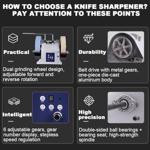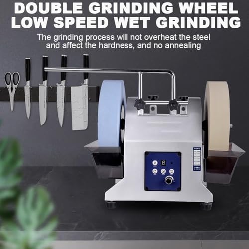 This electric knife sharpener is equipped with a versatile range of features designed to keep your knives in optimal condition. Included with the sharpener are a grinding wheel repairer, grinding paste, installation tools, belts, and two interchangeable grinding wheels: a 220-grit grinding wheel for coarse sharpening and a 2000-grit grinding wheel for polishing. The 220-grit wheel is effective in addressing chipping and rolling, making it ideal for sharpening tasks. Meanwhile, the 2000-grit green silicon carbide grinding wheel is specifically designed for polishing, ensuring your knives meet everyday sharpening needs. Specifications: Color: Silver + Blue + Gray; Material: Metal + Grinding Wheel + Plastic; Voltage: 110V; Power: 300W; Size: 49*26.5*34.5CM; Weight: 16kg. Packaging Contents: Electric knife sharpener * 1.
