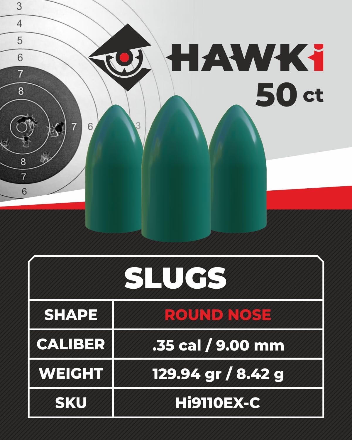 | Included Components | Hawki Airgun Pellets Slug Coated .35 cal / 9.00mm Caliber (129.94 gr / 8.42 g) 50 ct Hi9110EX-C | Designed for Hunting |