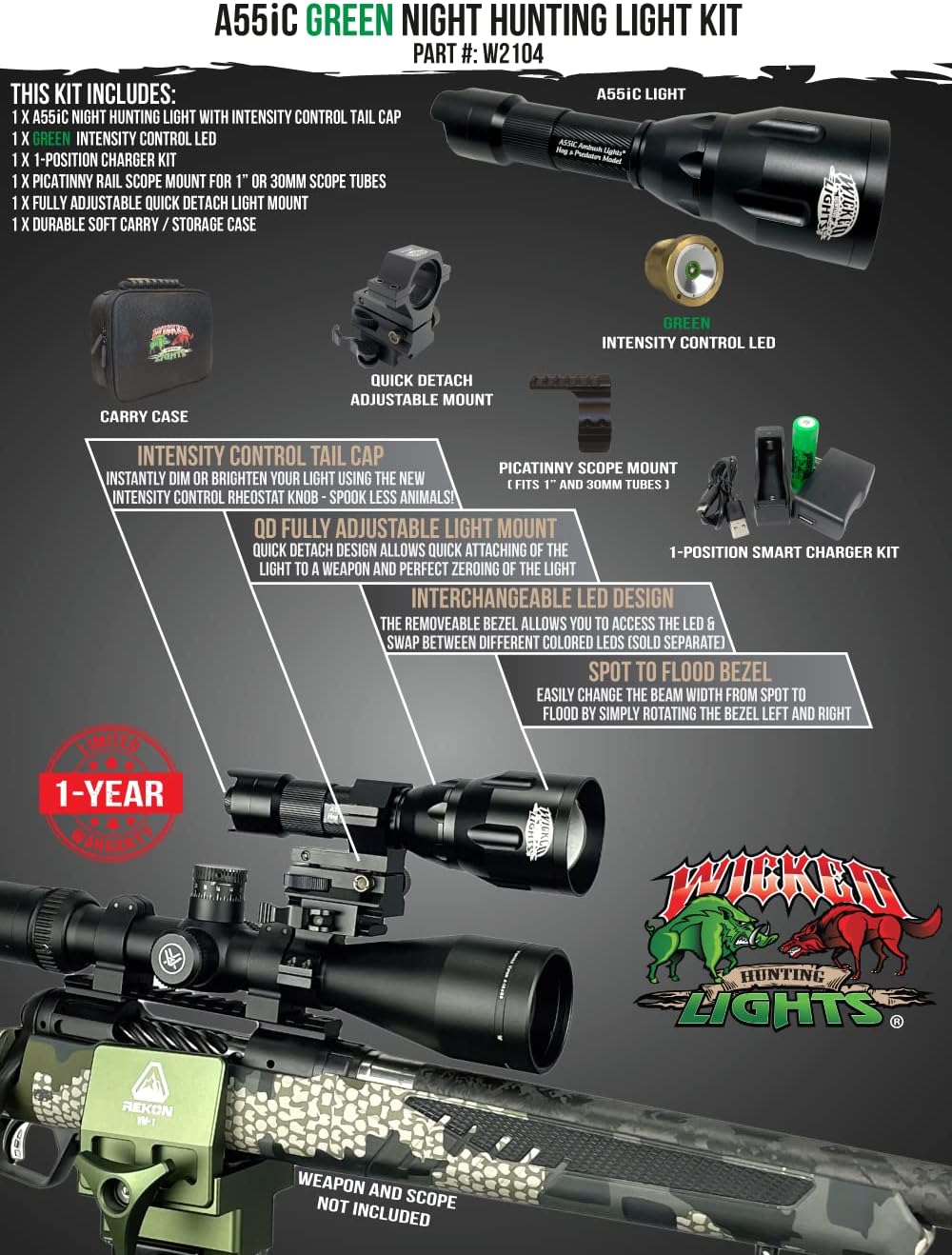 Successfully target hogs, coyotes, fox, bobcat, raccoon and varmints at night with the Wicked Hunting Lights A55iC Green Ambush Hog & Predator Hunting Night Hunting Light Kit with Intensity Control. The A55iC is purpose designed & built specifically for night hunting. This kit includes everything you need to get out and get hunting: 1 x A55iC Long Range Light with Intensity Control Tail Cap 1 x GREEN Intensity Control LED 1 x Quick Detach Adjustable Light Mount1 x 1 inch and 30mm Scope Mount 1 x Charger Kit 1 x Carry Case