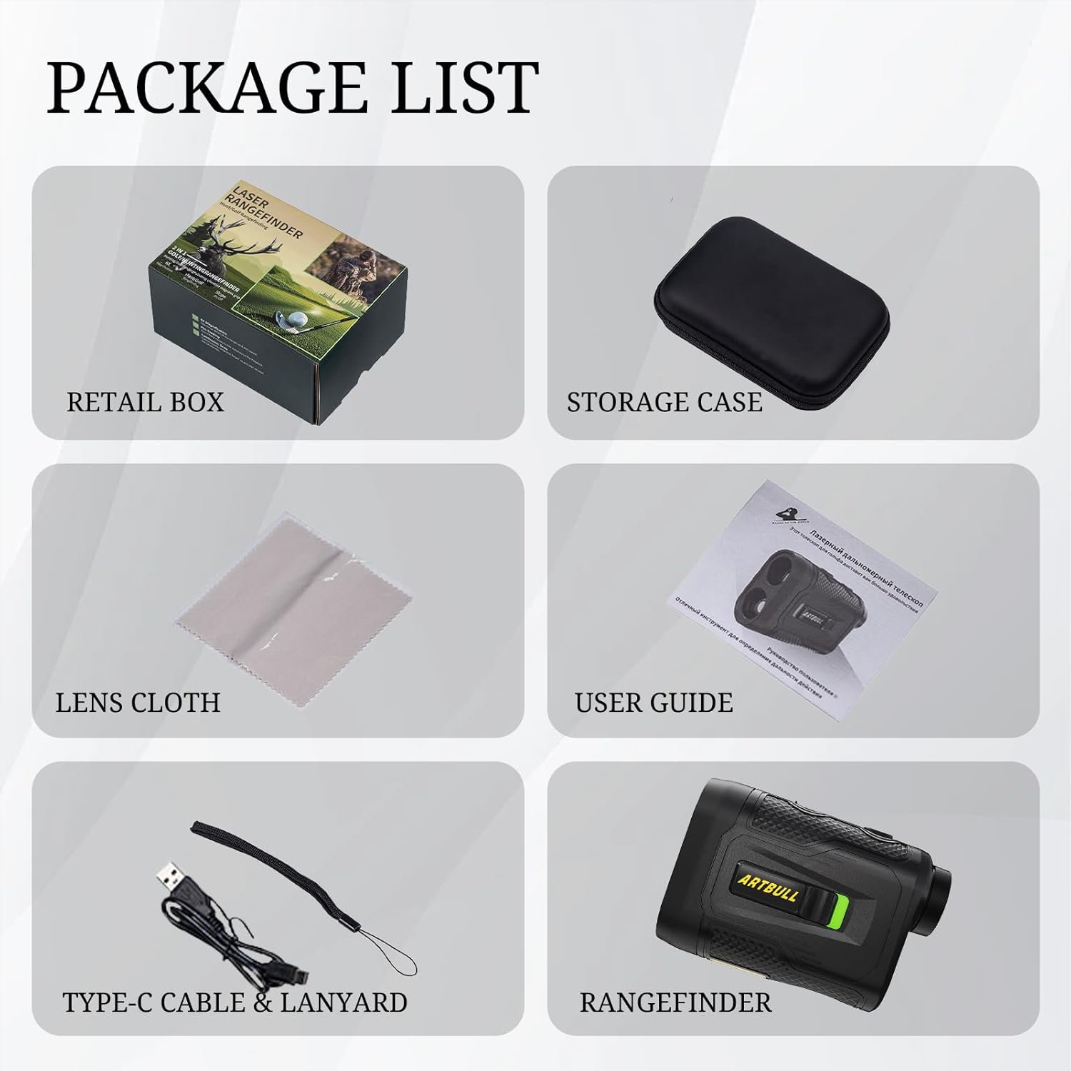 Perfect for a wide range of outdoor activities, from golf to surveying to hunting. All-in-One Versatility: From distance measurements to speed readings and height checks, this rangefinder offers multiple measuring modes to cater to golfers, hunters, surveyors, and outdoor enthusiasts. Flag Lock & Slope Compensation: Use the external slope switch to adjust for slope compensation in golf mode, and rely on the vibration feedback for confident flag-locking on the course. Precise 6X Magnification: The 6X magnification and multi-coated optics give you a sharp view of distant targets, helping you confirm distances accurately no matter the scenario. Built-in Magnet & Lightweight: The magnetic mount lets you easily attach the device to metal surfaces or your golf cart, while the lightweight design ensures comfort for all-day carrying. Rechargeable & Efficient: The USB-C rechargeable built-in lithium battery eliminates the hassle of disposable batteries and allows for quick, convenient recharging on the go. Ideal for: Golfers, hunters, hikers, surveyors, and anyone needing reliable distance, speed, and height measurements outdoors. What's in the box: Rangefinder unit (select 650 yd or 1000 yd model), USB-C charging cable, user manual.