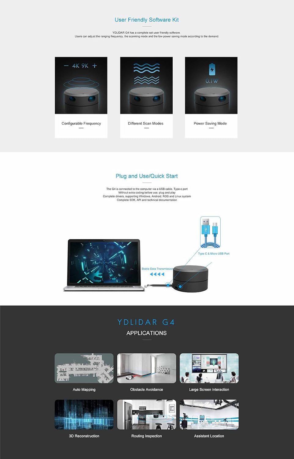YDLIDAR G4 - Lidar Rangefinder can be applied to the application field likeAuto Mapping,Obstacle Avoidance, Large Screen Interaction, 3D Reconstuction, Routing Inspection Assistant Location. Features: 360 degree omnidirectional scanning, 5-12Hz configurable scanning frequency Range frequency: 9000hz FDA Safety Standard: Class 1 Wide ranging range: not less than 16m Strong ability to resist ambient light interference Industrial brushless motor drive stable performance, Ultra long working life(up to 50000hours ) OS: Windows, Android, ROS and Linux Shipping list : 1x YDLIDAR G4 1x USB Type-C Cable 1x USB Adapter Technical Support Technical Documentation: http://www.ydlidar.com/download Product Information: http://www.ydlidar.com/product/G4 Expert Support: firefly@ smartfire.cn Skype: smartfire_cn Product Customization: firefly@ smartfire.cn