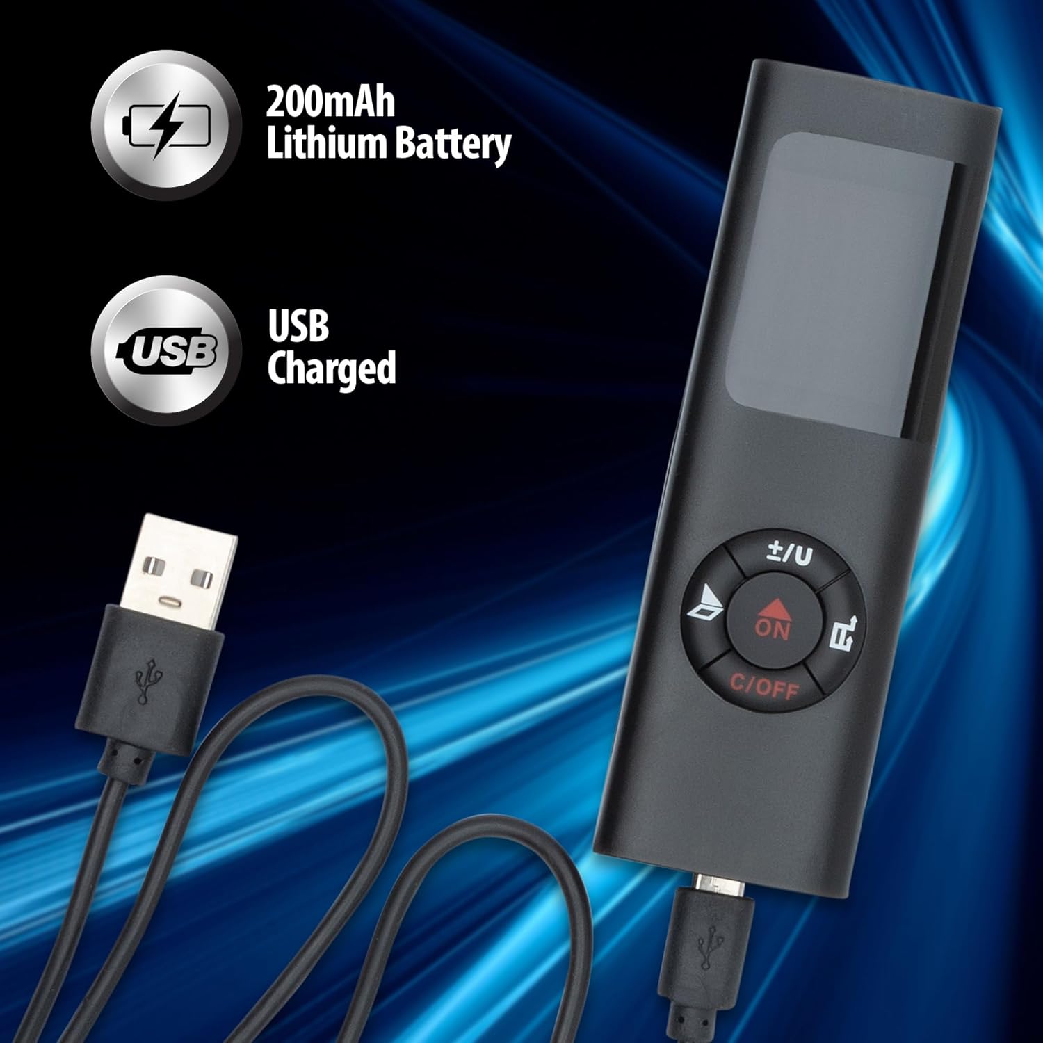 Experience the accuracy and convenience of the Innov8 Mini Laser Range Finder. It has an impressive ±2mm precision and a wide measurement range of up to 131 feet. Thanks to its powerful 200mAh lithium battery, this range finder can perform up to 2,000 distance measurements on a single charge and only takes 30 minutes to charge fully. Reading measurements is easy using the backlight LCD screen with multi-line display. At just 4”, this gadget is easy to take anywhere and has a durable ABS shell. This is a Class II Laser with a power of <1mW.