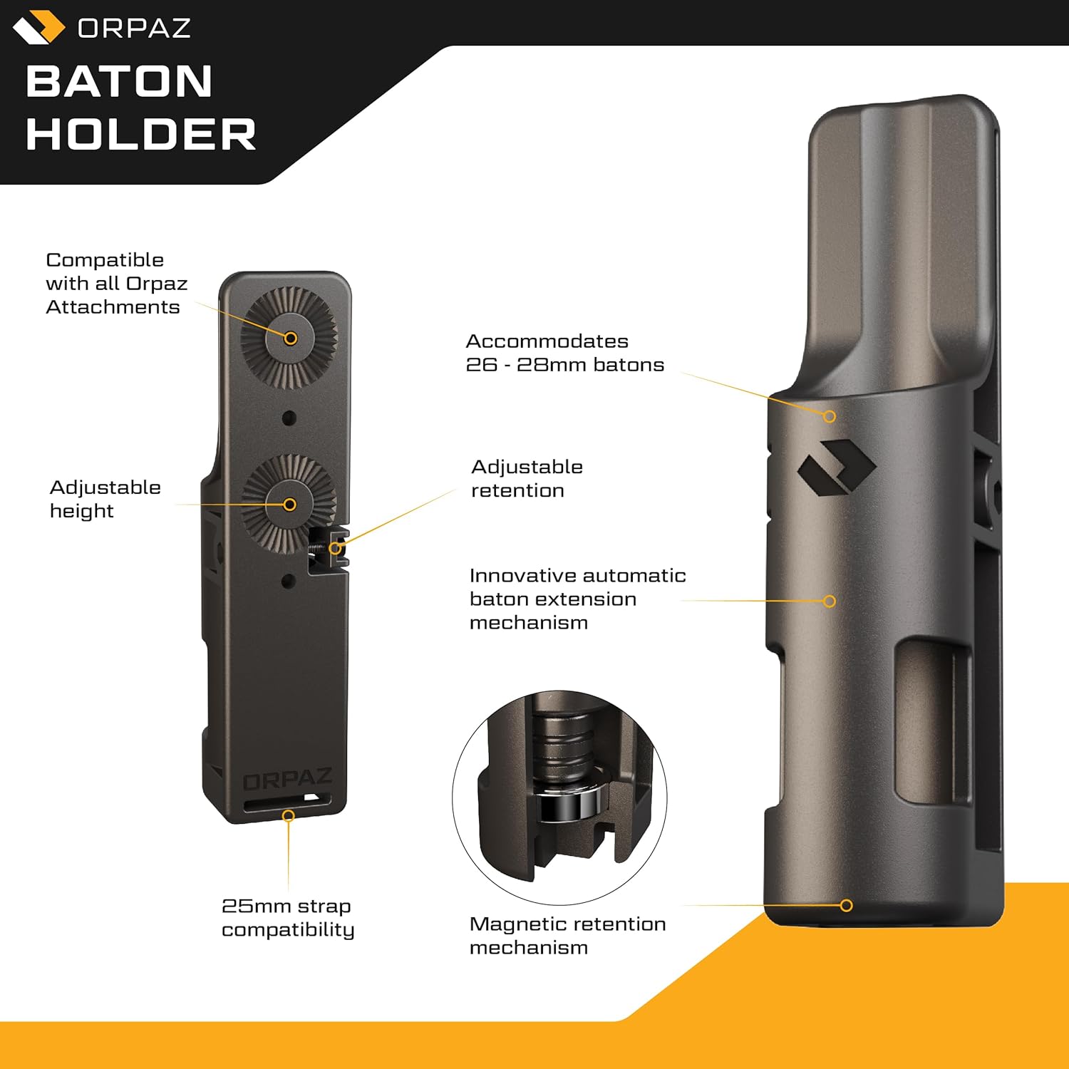 The Orpaz Tactical Baton Holder is engineered for fast, reliable access to your self-defense baton in critical moments. Designed to securely hold and deploy any collapsible baton, expandable baton, or telescopic baton for self-defense, this baton holster features an innovative magnetic retention system that automatically extends your collapsible baton as you draw. This ensures rapid deployment, which is crucial for self-defense baton retractable needs, allowing you to be ready in an instant. Constructed with rugged polymer and metal inserts, this baton holder for duty belt is built to withstand demanding conditions. The adjustable, quick-release belt clip locks securely onto belts up to 2.25" wide, ideal for law enforcement, security, or anyone carrying a police baton expandable. With a 360-degree rotation, the baton holder allows you to position your tactical baton comfortably, adapting to both daily tasks and high-intensity situations. This collapsible self-defense baton holster offers versatile, multi-use functionality. The magnetic feature can be removed, transforming it into a baton holster for passive carry or for use as a flashlight holder. The Orpaz Tactical Baton Holder is the ultimate choice for secure, accessible carry, whether itโs a self-defense baton expandable or a retractable baton self-defense solution.