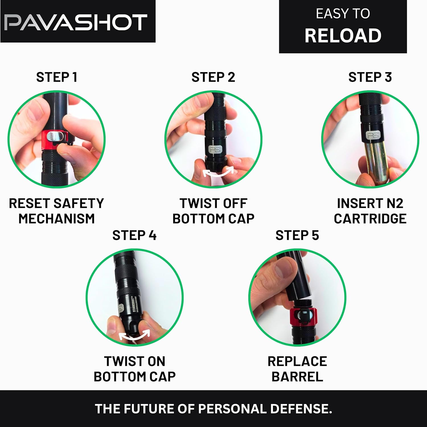 | Included Components | 2 Nitrogen cartridges, 2 Trigger safeties, Inert Blue Composite barrel, LIVE 0.5% PAVA Aluminum barrel, Stickshot Body |