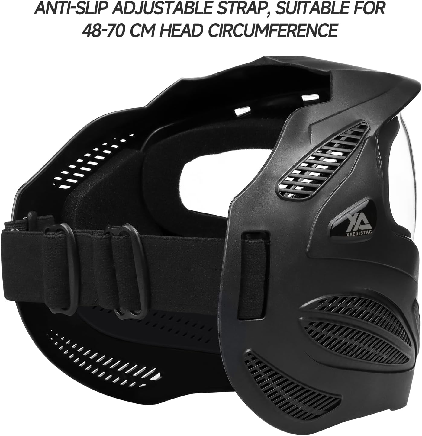 Xaegistac Paintball Mask: Dominate the Field Conquer the field with the Xaegistac Paintball Mask. Experience uninterrupted sightlines through its 210° panoramic lens, designed for fast target acquisition without blind spots. Built to meet ANSI Z87.1 safety, it withstands high-speed impacts. Breathes easy, stays fog-free: Competition-grade thermal lenses with dual anti-fog and smart ventilation ensure crystal clarity, even in intense action or humidity. The integrated sun visor adapts instantly to bright sun or light rain. Wear it longer: Soft memory foam hugs your face comfortably, wicks moisture, and the adjustable anti-slip strap ensures a secure, stable fit. Lightweight (420g) yet durable, it's built for lasting performance in paintball or airsoft.