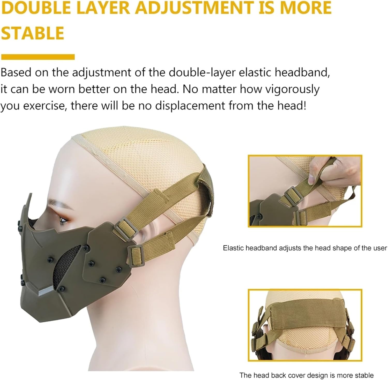 Applicable head circumference: 52.62CMCompatible with Fast helmets onlySide clip design for easy fixation and disengagement of masksMulti-universal: tactical air gun paintball, outdoor, dance, halloween, movie props, role-playing partiesMaterial: constructed from TPE (thermoplastic elastomer) and some steel meshFeatures: At least 700 fps impact resistance, comfortable filling, adjustable, lightweight, breathableCompatible with most eye protection goggles. The packaging includes side clips for mounting various quick helmets. Simply uninstall the belt and install the side clips and place the mask on the helmet rail.Product Pack: A Face MaskCOLOR:Mud color/Green/Black