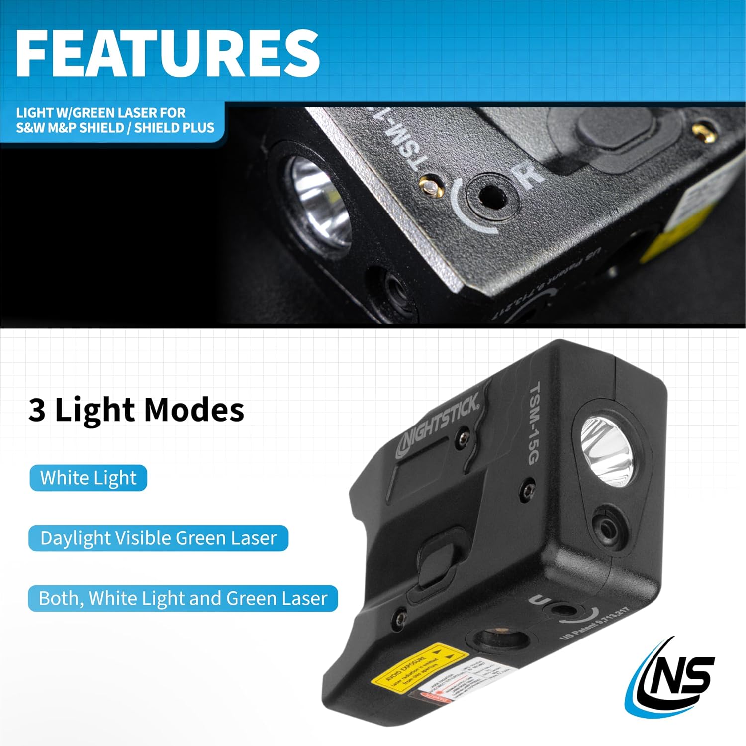 The TSM-15G Subcompact Tactical Weapon-Mounted Light with Green Laser for Smith & Wesson M&P Shield 9mm and .40 caliber sub-compact pistols uses a super-bright LED rated at 150 lumens working in conjunction with a precision-engineered miniature reflector to create a bright white beam of light rated at 100 meters. This weapon light features completely ambidextrous and intuitive toggle switches on each side of the light to operate the momentary-on and constant-on lighting modes or Class IIIa 532nm daylight-visible green laser. These lighting modes include white light, laser, or both light and laser. The two glass-filled nylon plastic housings of the TSM-15G is designed to lock onto the front of the pistol's trigger guard for secure installation and the lowest profile possible. The weapon light includes Nightstick MagMate USB magnetically coupled charger, a combination gun lock for secure charging, and Allen screwdriver for installation and laser aim adjustments. Export Controls: The export of this product is restricted by the U.S. Department of Commerce as a controlled commodity ECCN 0504.f. Subsequent resale and reexports of this product are subject to U.S. Export Administration Regulations (EAR).