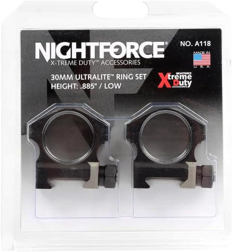 NIGHTFORCE X-TREME DUTY ULTRALITE FOUR-SCREW RINGS SETS Nightforce X-Treme Duty Ultralite 30mm Rings are crafted of machined 7075-T6 hard anodized aluminum, with titanium crossbolts and jaws, giving you the performance of steel at half the weight. This unique construction provides strength well beyond that normally found in lightweight rings. The four-screw ring will provide a lifetime of service for most applications. MAIN FEATURE: - Approved for use under the heaviest of recoil conditions; - CNC machined 7075-T6 black aluminum bodies and titanium beta series cross bolt and jaw; - Available in various sizes and colors. NOTE: Clean all mating surfaces thoroughly before mounting. Use a torque wrench and do not exceed recommended torque values: Crossbolts - 68 in-lb Cap Screws - 25 in-lb NIGHTFORCE ACCESSORIES: The Nightforce X-Treme Duty line is our most rugged and advanced Rings, Mounts, and Bases. A combination of Steel, Aluminum, and Titanium materials are machined to precise tolerances, producing a lightweight and strong mounting system that ensures the scope is not subjected to stress, strain, or bending as the ring screws are tightened.