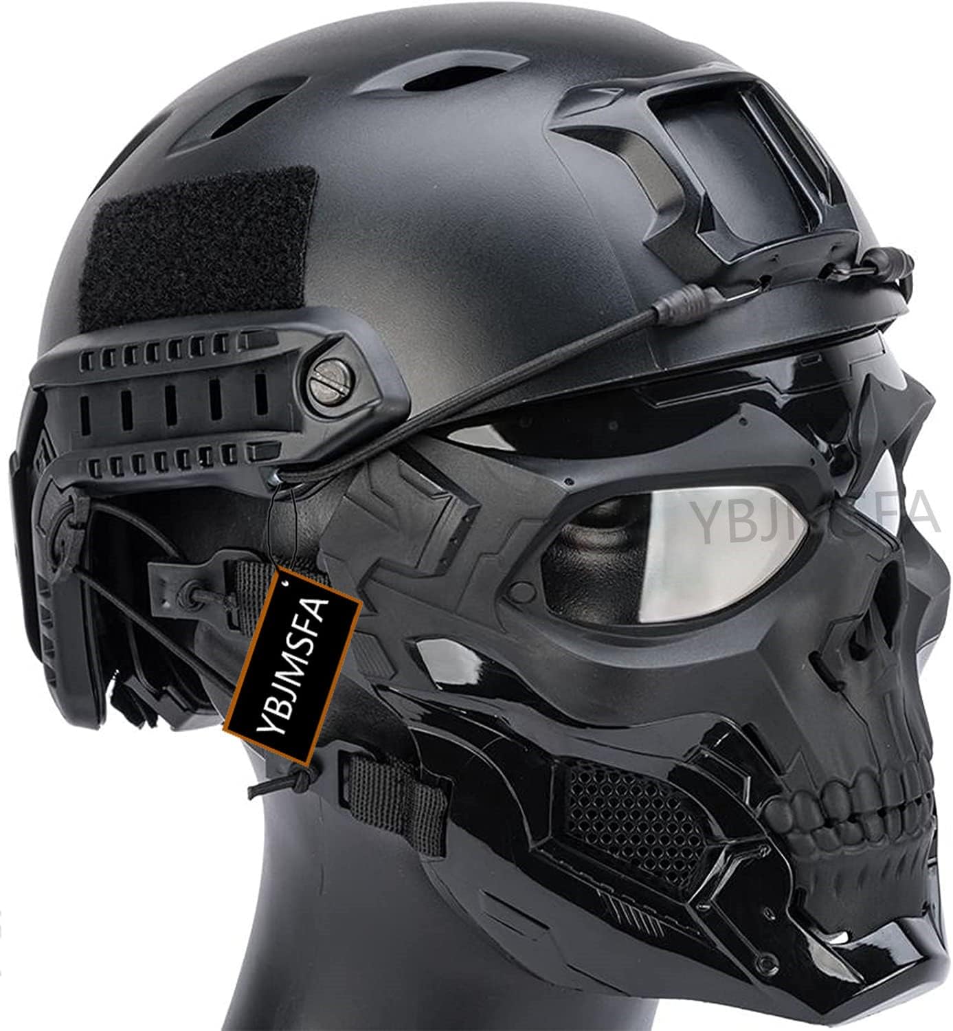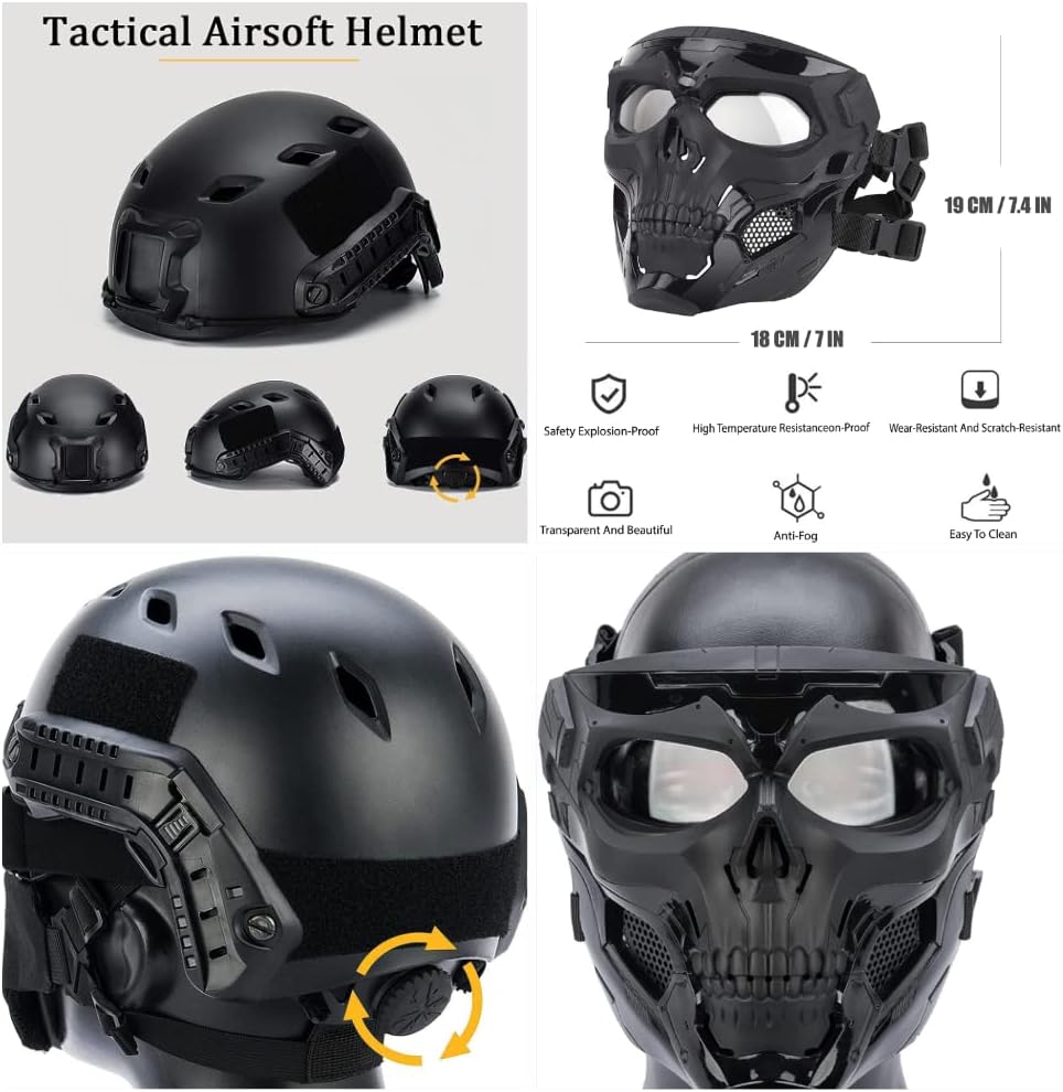 what will you get? 1XFAST Helmet, Helmet Accessory Set (9 Pieces), Helmet EVA Pad Set, 1X Tactical Skull Mask Features: EASY ADJUSTMENT: Adjustable suspenders and chin/neck pads, lightweight and durable helmet, premium head protection construction. The square bracket on the front is designed to hold the corresponding/optical equipment, directly connecting the communicator/optical equipment, which is of increasing importance in military missions. Therefore, it is an indispensable part of tactical helmets. Adjust the rear dial knob for adjusting head size. One size fits best, head circumference 21.2-24"/55-60cm/convenient to wear/enhanced stability. Cool looking and well protected mask: Weight: 260g, comfortable face protection with foam padding for maximum comfort. Lightweight and Breathable: Multiple Airflow Openings and Mesh Cheek Sides Ensure Good Airflow, Dual Attachment Options: Back Head Strap and Helmet Attachment Strap. 100% Customer Satisfaction Guarantee: If you have any questions, please do not hesitate to contact us and we will immediately correct the situation or provide a refund/exchange.