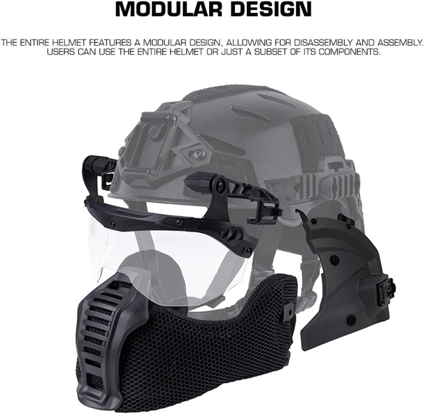 Adjustable suspension and chin strap help tune the fit Flip-up integrated goggles for fast switch between covered and open-face views Front NVG-style mount and side rails for dummy NV, cameras, lights or other accessories Adjustable suspension and sponge pads to improve comfort and helmet stability Set includes 1 × full-face tactical training helmet with modular lower mask, ear covers and integrated flip-up goggles.