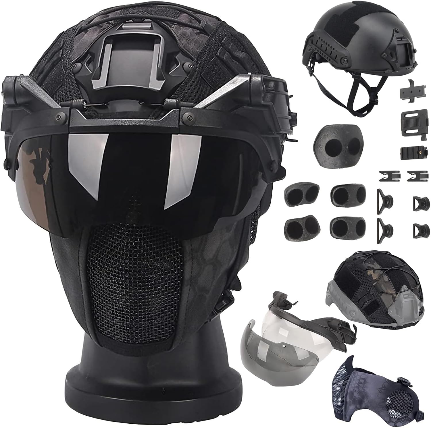 Looking for a tactical protective gear set that can be disassembled and used individually? Want a complete outdoor gear set that fully protects your head and face? Looking for hardcore gear suitable for various scenarios? Wearing this tactical helmet will definitely make you the coolest person around!This tactical set includes an ABS one-piece helmet with an adjustable fit, impact-resistant flip-up PC-lens goggles, a dropball-tested metal mesh mask, and a 500D nylon helmet cover. These can be used separately or combined for full head and face protection in paintball, tactical games, cycling, and other outdoor activities.Product Contents:Helmet*1Helmet Cover*1Goggles*1Lens*2Face Mask*1Stop settling for helmets that hold you back. Choose the one that’s built for your pain points, your mission, and your trust.We have a dedicated customer service and technical team to respond to your product inquiries and usage questions at any time, ensuring your equipment is always in optimal condition.