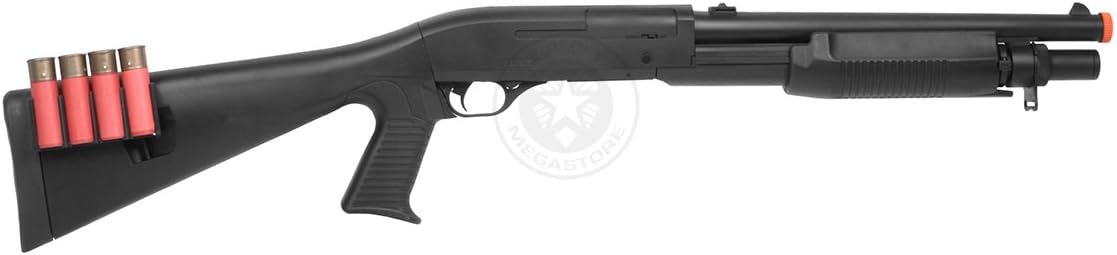 This Airsoft Shotgun has all the great features you want when shopping for an Airsoft Shotgun. Its a very unique airsoft shotgun because it uses an authentic shotgun shell cartridge that holds the airsoft BBs. This Shotgun not only looks great but it also shoots extremely hard at 380 feet per second. With a solid rear stock you will be able to completely control this gun everytime you pull back the trigger so you can be sure you hit your target every time! This gun comes with 30 shell magazines each which hold 14 rounds! Features: Spring Powered Shell Magazine 30 Round Shell Magazine Capacity Solid Rear Stock Plastic Construction Pump Action Adjustable Hop-Up Hop-Up Includes: Spring M183A2 Tactical Pump Action Shotgun Airsoft Gun 4 x30 Round Shell Magazines Shell Holder Speed Loader Sample Bag Of BBs Specifications: FPS: 400 (With .12g BBs) Magazine Capacity: 30 Rounds Size: 35.5 Inches