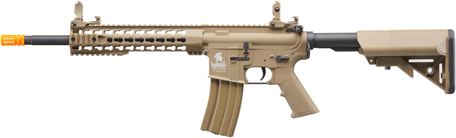 LANCER TACTICAL GEN. 2 CARBINE 10"" AEG LT-19 AUTOMATIC AIRSOFT GUN. The Generation 2 Lancer Tactical entry level Carbine has an outstanding list of features. The lightweight ABS construction is reinforced with a tough nylon polymer, making it able to withstand heavy use in extreme situations while keeping the internals safe and efficient! The full metal outer barrel will not tarnish and ensures a fixed trajectory. The 20mm picatinny optic rail allows you to mount your choice of red dot sights and magnified scopes. This AEG is a great airsoft gun for both outdoor and CQB engagements, with a six position retractable crane stock. A quick change spring gearbox can be used to change your FPS from CQB to Outdoor MilSim on a whim, its ported piston head maintains excellent air compression inside the cylinder, and the included 6.03 mm tightbore barrel gives you the range and precision you'd never expect from similar AEGs. The upgraded gearbox has even tougher metal gears that are much more efficient than the traditional pot-metal gears. The teeth along the cylinder are metal and the motor has been upgraded to move even faster. The metal inner barrel makes the gun highly accurate even at longer range targets. The adjustable crane stock enables an easy-access battery storage of nunchuck and buffer tube type batteries. Low resistance wiring prevents any damage from high voltage batteries and also makes your trigger more snappy. To make sure you can immediately field this AEG, Lancer Tactical has included a rechargeable 9.6v nunchuck battery, a rechargeable wall charger with a cut-off light, and a 1,000-round bag of 0.20g BBs to jump into the action!