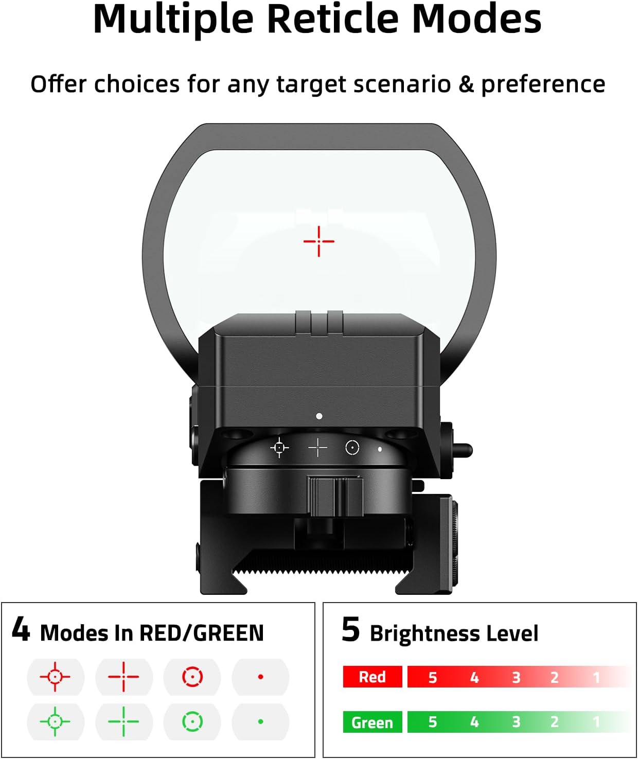 | Reticle Type | Starburst, Dot, Bullseye, Cross (Red & Green) |