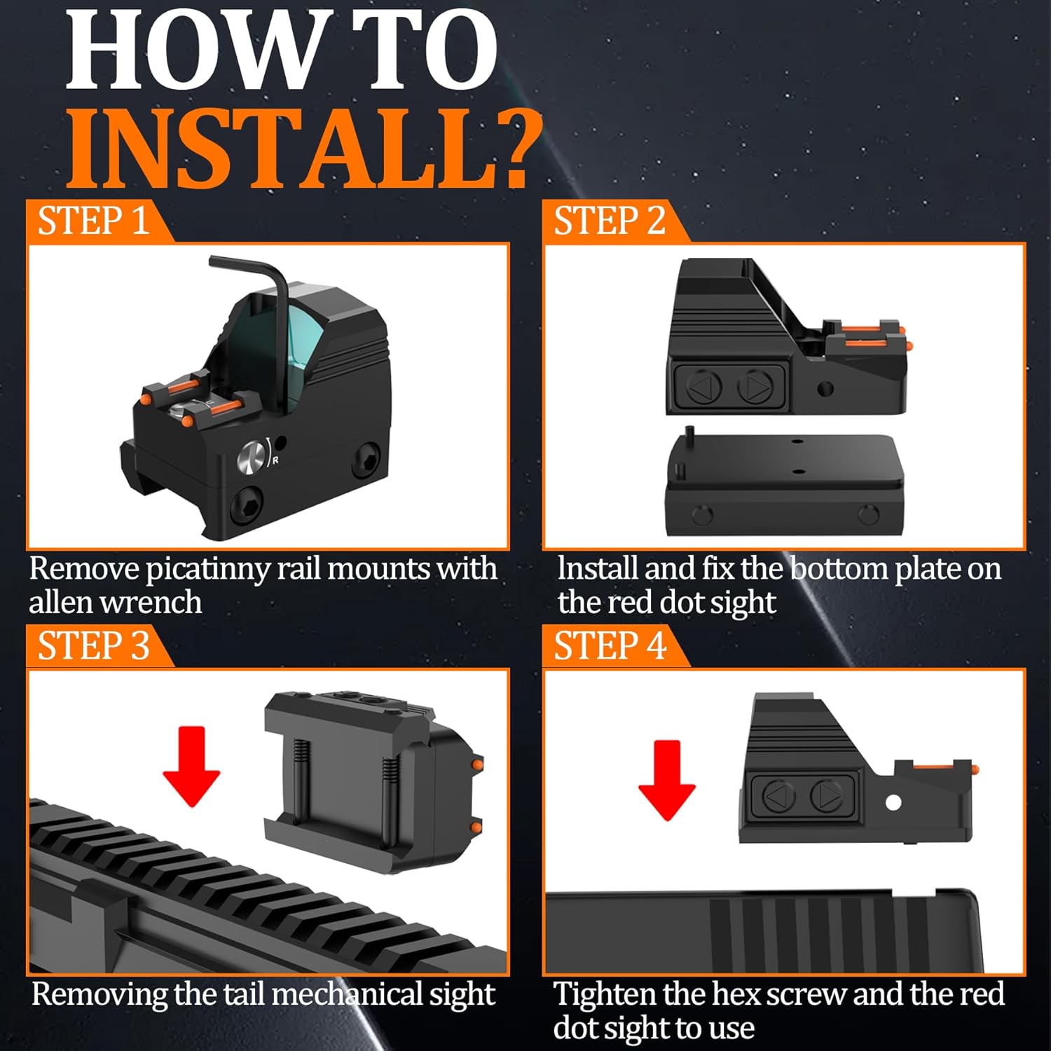 | Included Components | 1x 1913 Mounts, 1x Adjustable LED Red Dot Sight, 1x Cleaning Kit, 1x User Manual, 1x for Glock Mounts |