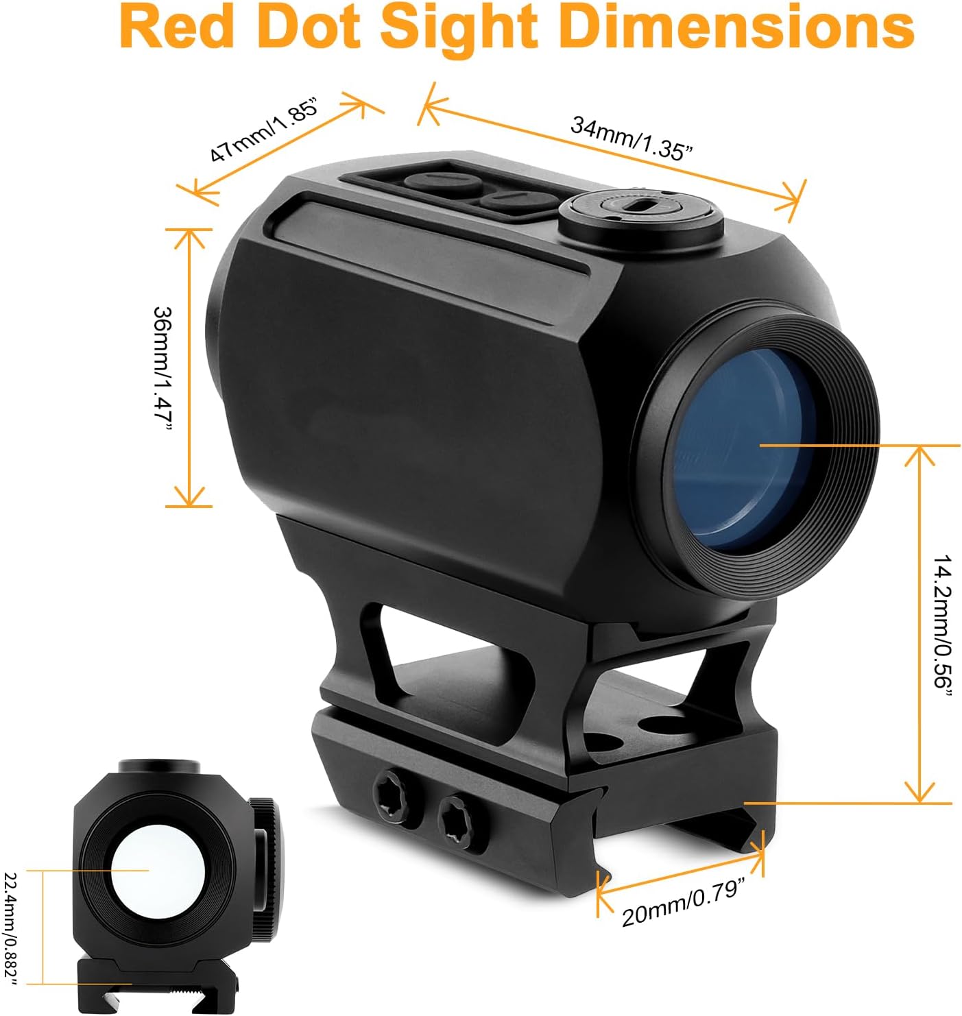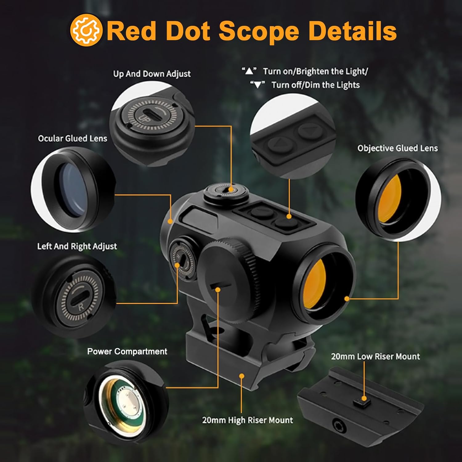 | Included Components | 1x red dot sight, 2x 20mm Picatinny mounts, 1x Hex wrench, 1x adjustment key, 1x lens cloth, 1x user manual, 1x packing box |