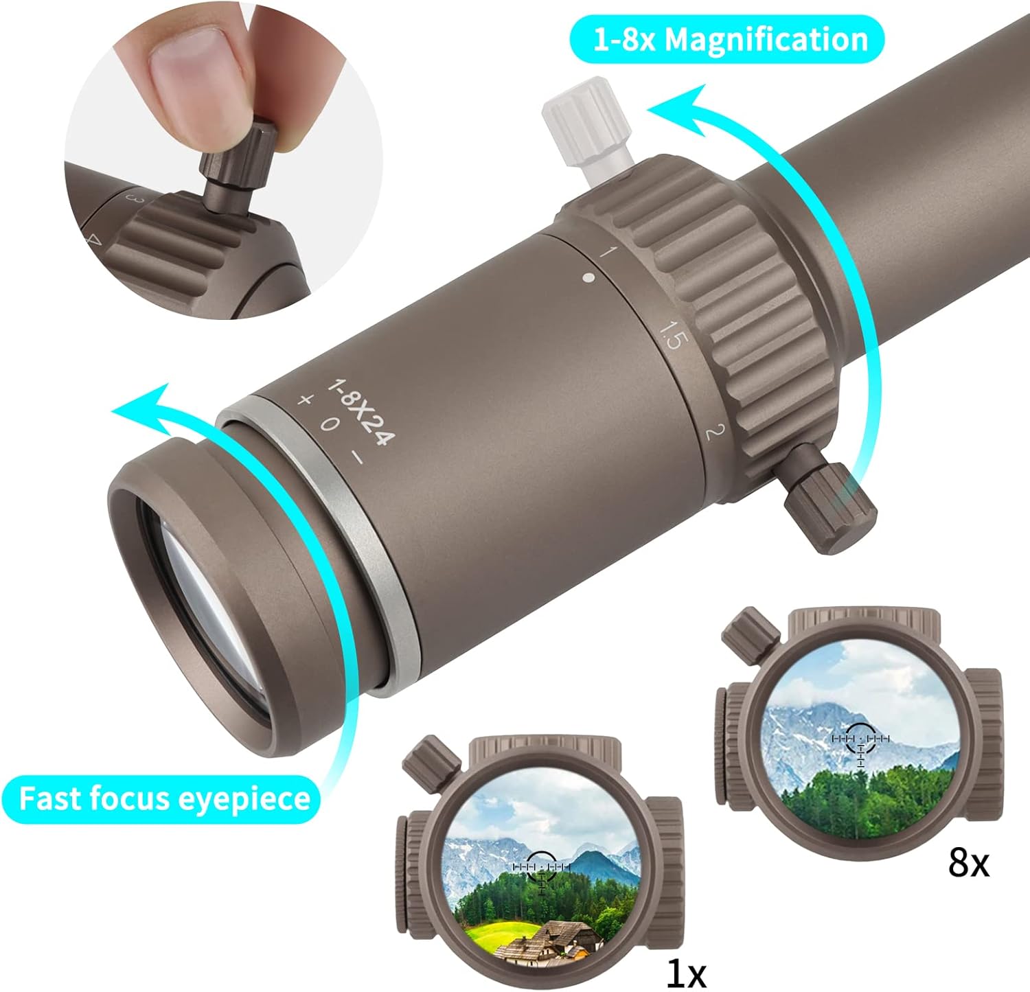 ToopMount 1-8x24 Tactical Scope, 11 Levels Red Illuminated Reticle Scope, 1/2 MOA Windage & Elevation Adjustable Optics Sight, Waterproof Shockproof FMC Lens Sight with 20mm and 11mm Mounting RingsMaterial: 6061-T6 Aircraft Grade AluminumTube Diameter: 30mmWaterproof: IP67Fogproof: Nitrogen PurgedReticle Focal Plane: 2nd Focal PlaneFast Focus Eyepiece: YesLength: 10.75in / 273mmWeight: 19.3oz / 547gMagnification: 1x-8xObjective Lens Diameter: 24mmLens Coating: Fully Multi-coated, Full Wide Band, Waterproof Coated, Low Light Enhancement Field of View at 100 Yds: 105.8ft - 13.1ftExit Pupil (mm): Low 7.5mm - High 3mmEye Relief: 3.5in/90mmReticle Material: Glass Illuminated Reticle: 11 Levels Red Turret Style: Capped Adjustmnet Range :182MOA Zero Reset/ Locking/ Zero Stop: Zero Reset Click Value @100 Yds: 1/2 MOAPackage Included:1x 1-8x24 Scope2x Flip Up Lens Covers2x Heavy Duty Picatinny Scope Rings2x Heavy Duty Dovetail Scope Rings1x Lens Cleaning Cloth3x Allen Wrenches1x Throw Leverls1x Throw Leverls cap1x Manual1x Zero Stop ShimNoticed: If you have any further questions or needs, please feel free to contact us. We will try our best to solve your problem as soon as possible.