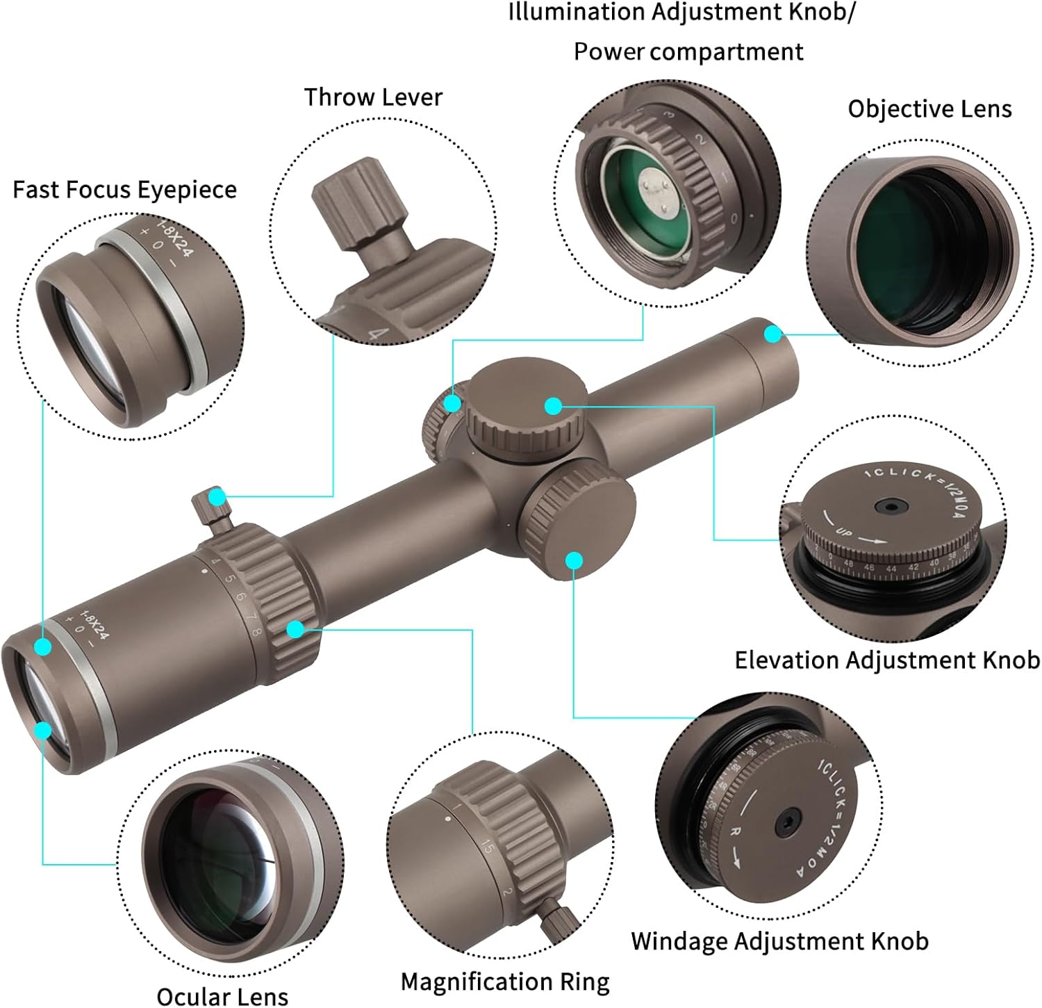 | Included Components | 1x 1-8x24 scope, 2x flip-up lens covers, 2x 20mm Picatinny scope rings, 2x 11mm Dovetail scope rings, 3x wrench, 1x cleaning cloth, 1x throw lever, 1x user manual |