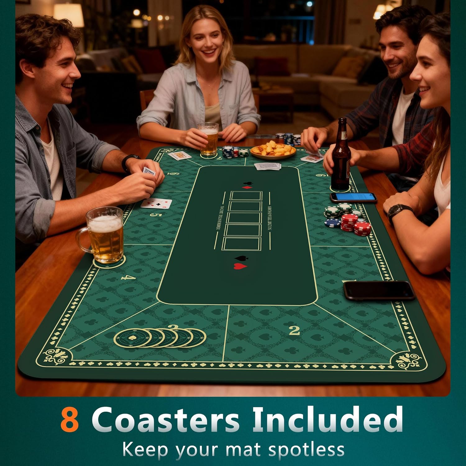 Elevate your game nights with our premium 70"x35" poker table topper. Designed for up to 10 players, this professional-grade mat transforms any table into a stylish home casino. Featuring an authentic felt surface with elegant designs, it provides the great smooth area for dealing cards and stacking chips. The natural rubber and foam-treated bottom enhances friction for steadfast stability during intense gameplay, while the included storage tube guarantees wrinkle-free flatness. Complete with a zippered carry bag and 8 non-slip coasters, this all-in-one set offers both portability and protection. Easy to clean and ready to gift, it's the ultimate solution for memorable poker tournaments, blackjack sessions, and lively gatherings with friends.