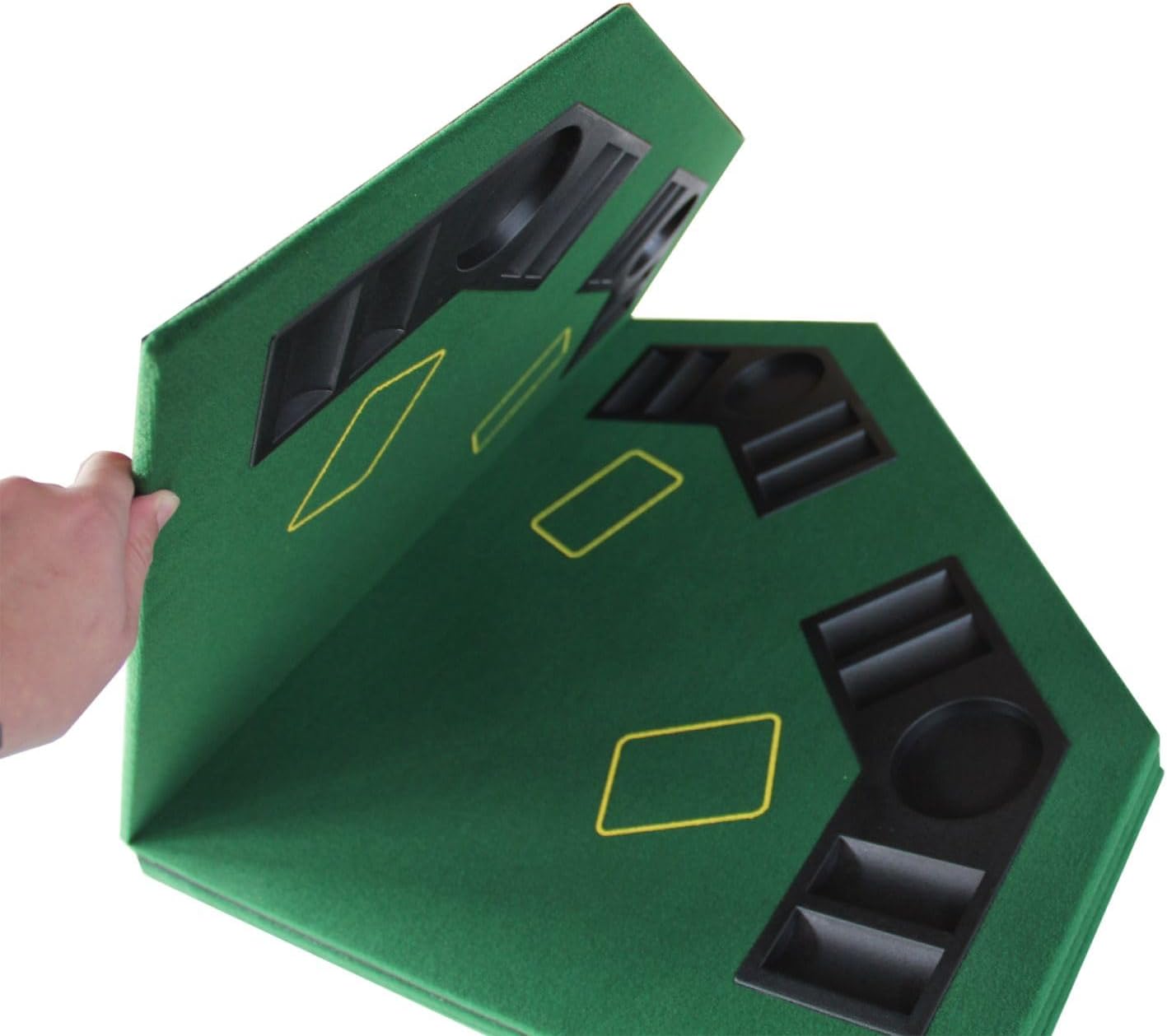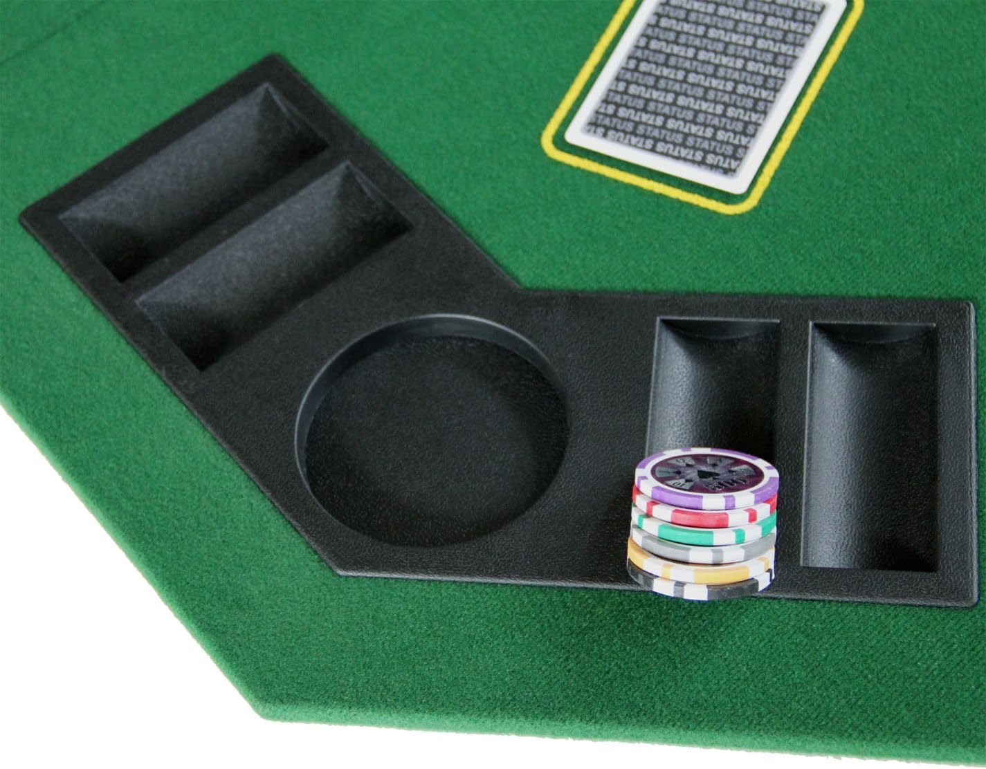 Transform any table into a premium poker venue with this professional-grade 48-inch octagonal folding tabletop. Perfect for hosting Texas Hold'em games, this portable layout accommodates up to 8 players in style and comfort. The rich green felt surface provides smooth card play, while built-in cup holders and chip racks keep everything organized and within easy reach. Measuring 48 inches across and just 0.5 inches thick, this lightweight yet sturdy MDF construction weighs only 15 pounds. The innovative folding design makes storage and transport a breeze - it comes complete with a black vinyl carrying case with convenient handles. When game night's over, simply fold it up and tuck it away until your next poker tournament. The classic casino-style design features clearly marked card positions and an elegant curved text layout that adds authentic gaming atmosphere to your home entertainment space. Ideal for both casual game nights and serious poker sessions, this table top brings the excitement of casino gaming right to your home.
